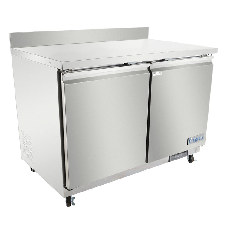 Empura, E-KUC48W, Undercounter Reach-In Refrigerator, work, top, 2 swing solid doors, 48.2"W x 29.9"D x 35.5"H, 10.1 cu. ft. capacity, 3.9" backsplash, 2 shelves, left & right hinge, 33-41 F temperature range, 1/8 HP back reciprocating compressor, 115v-60hz-1ph, 3 amps, NEMA-5-15P power cord, 478 BTU(LBP), foam insulation, magnetic gasket, electronic thermostat, automatic defrost, digital temperature control, ETL, ETL Sanitation, Tested and conforms to NSF-7 Standards, Empura Refrigeration