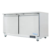 Empura, E-KUC60F, Undercounter Reach-In Freezer, 61.2"W x 29.9"D x 35.5"H, 13.2 cu. ft. capacity, (2) swing door solid doors, (2) shelves, -10F to 0 F temperature range, 1 HP back reciprocating compressor, foam insulation, magnetic gasket, electronic thermostat, automatic defrost, digital temperature control, 5 amps, NEMA-5-15P power cord, 1,877 BTU (LBP), 115v/60Hz/1ph, ETL, ETL Sanitation, Tested and conforms to NSF-7 Standards, Empura Refrigeration