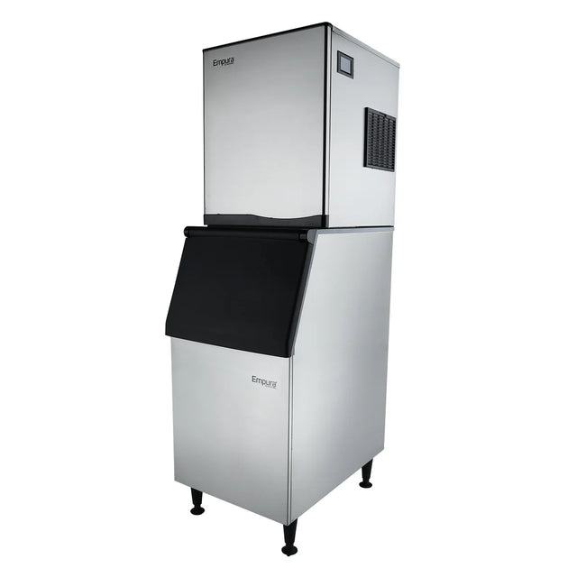 Empura, E-MCFB500, Ice Machine, 22-1/2"W x 32-5/16"D x 67-1/16"H, modular, cube-style, air cooled, full cube, combo with ice bin, 308 lbs. ice storage capacity, 9.8 amps, 500 lbs. 24-hour ice yield, 40-100 F ambient temperature range, <70 db. average running decibels, 3,514 BTU per hour, 304 stainless steel material - stainless steel (exterior), ABS material - plastic (exterior), ABS material - plastic (interior), NEMA 5-15P plug type, 4.6 KWH power kWh/100 lbs. ice, R290 refrigerant, adjustable feet, 3/4 inch water inlet size, 15-70 PSI water pressure range, 40-90 F water temperature range, 48.8 liters water usage to produce 100 lbs. of ice, 12.9 gallons water usage to produce 100 lbs. of ice, 115v/60Hz/1-ph, ETL US/CANADA Commercial Equipment, ETL Sanitation NSF-4 Standards, Empura Ice Machines