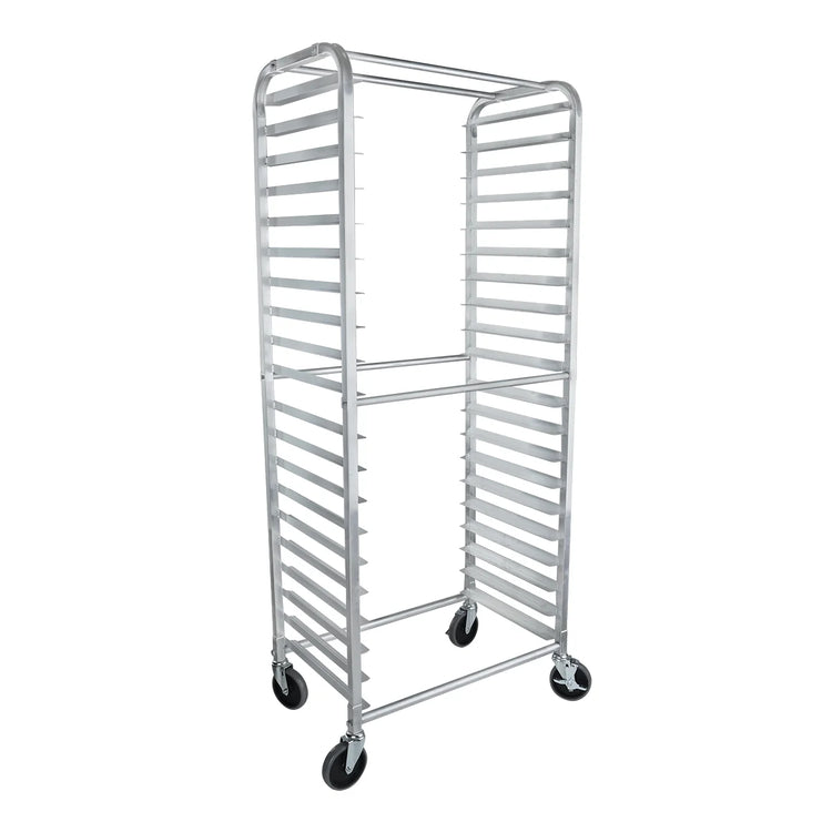 Empura, E-RACKECO20A, Pan Rack, Bun, 20 pan, aluminum, full height, open, end load, (unassembled), (2) locking swivel casters / (2) non-locking swivel casters, (4) total polypropylene wheel casters, 3" spacing, 20 full size / 40 half size bun/sheet pans, 350 lbs weight capacity, 55 lbs individual shelf capacity, NSF, Empura Stainless