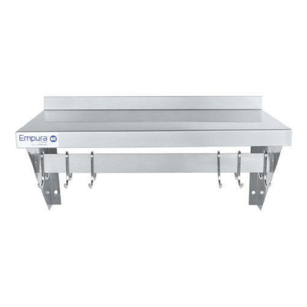 Empura, E-WPS-1236, Pot Rack, Wall-Mounted, 36" x 12" stainless steel wall mounted Pot Rack with Shelf and 18 gauge galvanized Hooks, NSF, Empura Stainless
