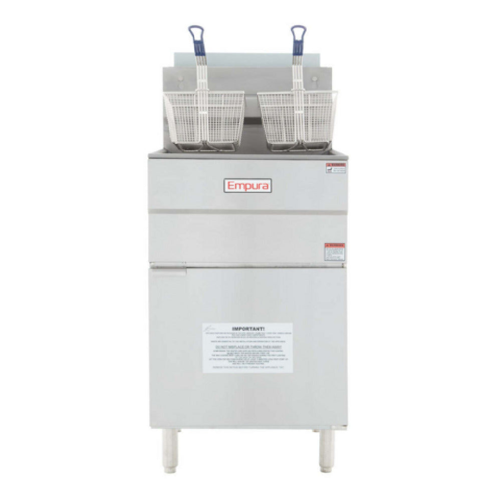Empura, EGF-70/80_LP, Gas Fryer, liquid propane, 21"W x 30-1/4"D x 46-1/2"H, commercial, floor standing, 2 baskets with 80lb oil capacity, 150,000 BTU, 5 tube style burners, 200-400F temperature range, 1 without split fry pot (19-7/8"Wx13-7/8"D), 1/2" rear national pipe thread gas connection, 1-1/4" drain valve, 6" stainless steel adjustable plate mounted legs, stainless steel cabinet, CE Certification, ETL, ETL Sanitation, cETLus, Tested and conforms to NSF/ANSI Std. 4, Empura Equipment