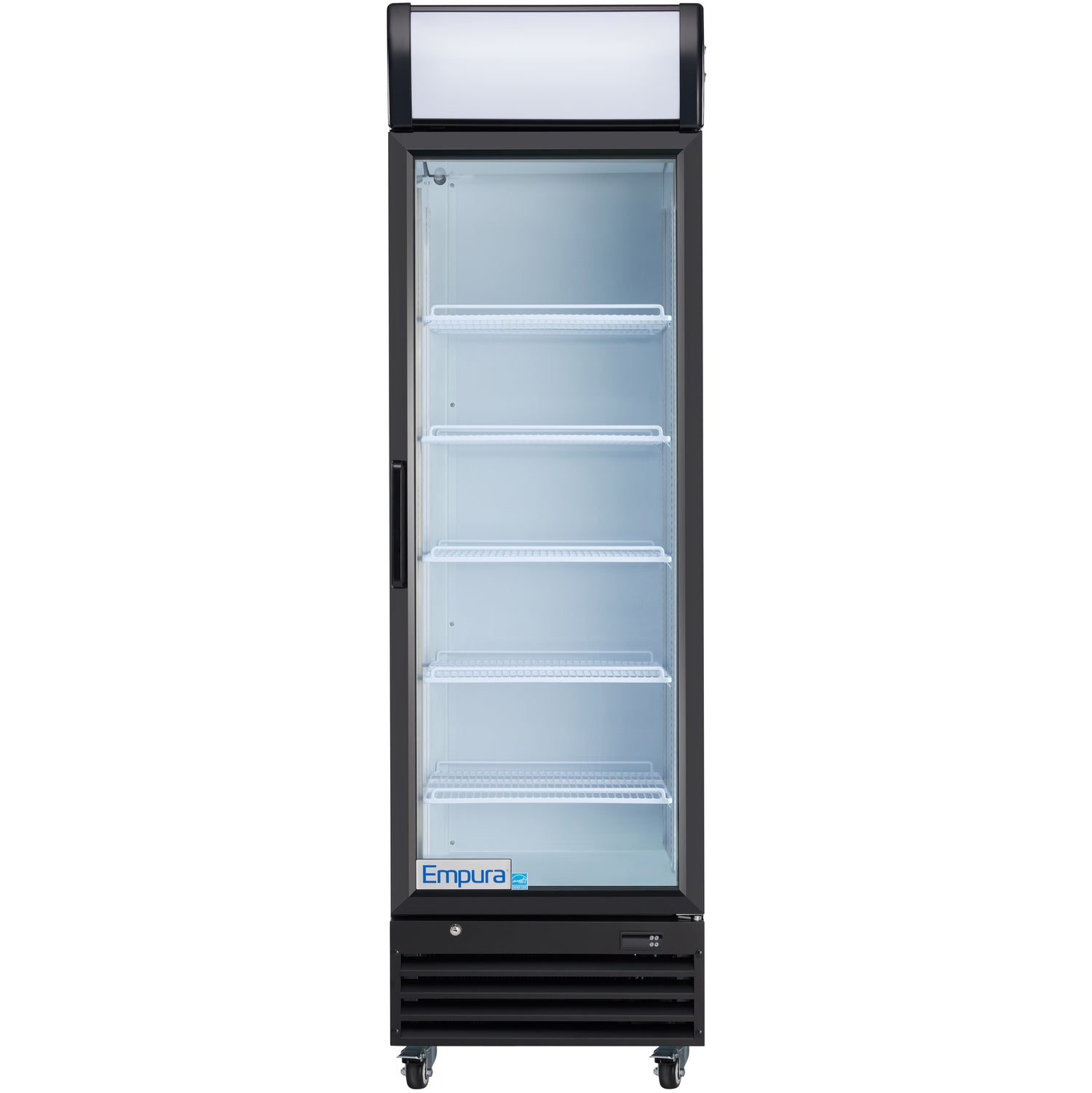 Empura, EGM-13B, Refrigerated Merchandiser, 22.72"W x 23.82"D x 77.95"H, 12 cu. ft. capacity, (1) glass swing door, (5) shelves, baked enamel steel black exterior and white interior, 32-50 F temperature range, 1/12 HP back compressor, R290 CFC-free refrigerant, electronic thermostat, digital LED temperature display, foamed-in-place high-density CFC-free polyurethane insulation, 665 BTU/h, 1.6 amps, US plug type, 110v/60Hz/1ph, ETL, ETL Sanitation, cETLus, Tested and conforms to NSF-7 Standards, Empura Refrigeration