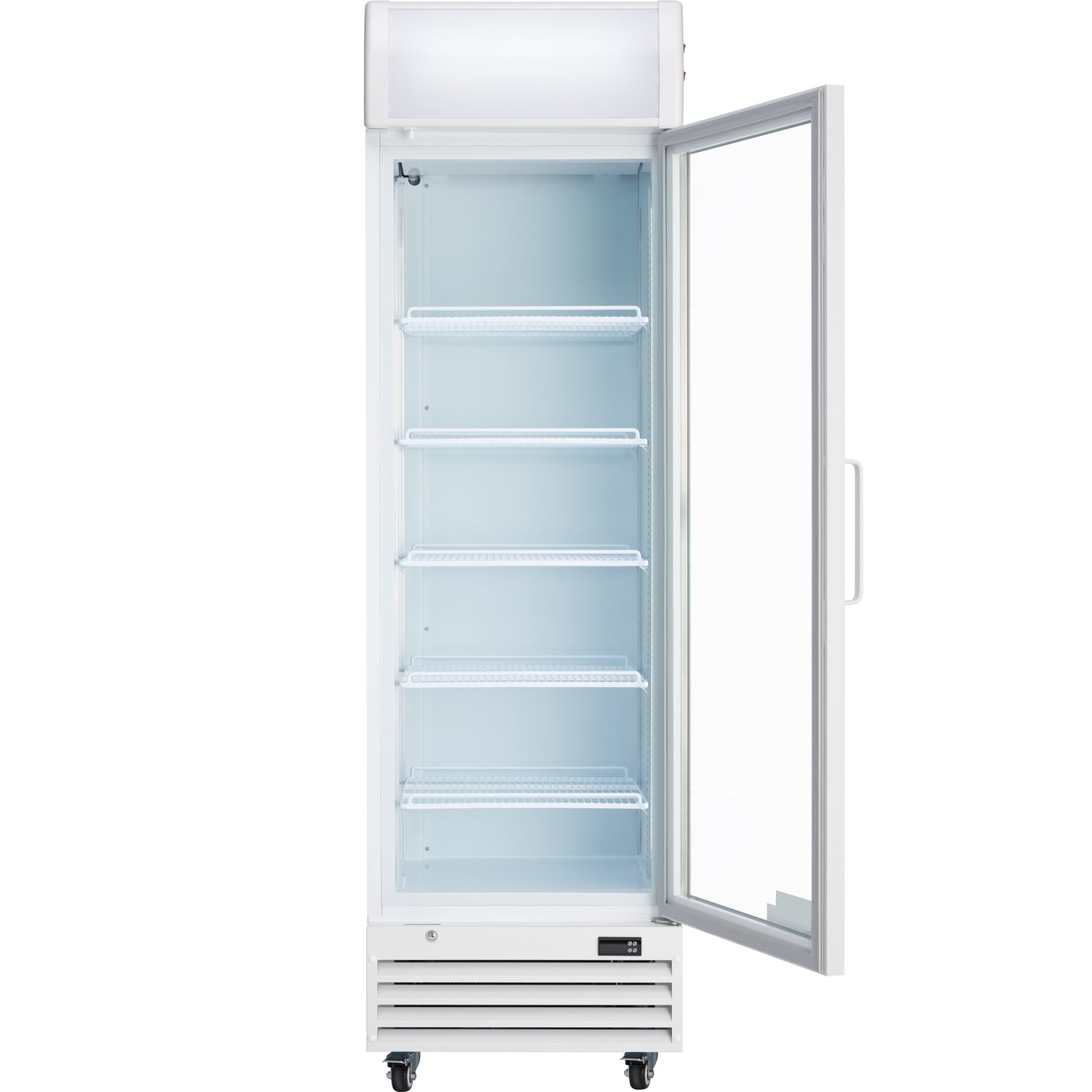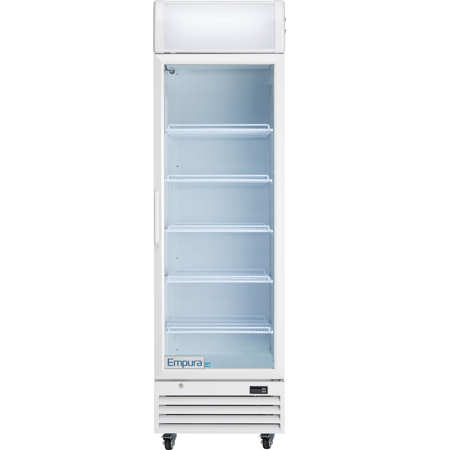Empura, EGM-13W, Refrigerated Merchandiser, 22.72"W x 23.82"D x 77.95"H, 12 cu. ft. capacity, (1) glass swing door, (5) shelves, stainless steel white exterior and interior, 32-50 F temperature range, 1/12 HP back compressor, R290 CFC-free refrigerant, electronic thermostat, digital LED temperature display, foam insulation, 665 BTU/h, 1.6 amps, US plug type, 110v/60Hz/1ph, ETL, ETL Sanitation, cETLus, Tested and conforms to NSF-7 Standards, Empura Refrigeration