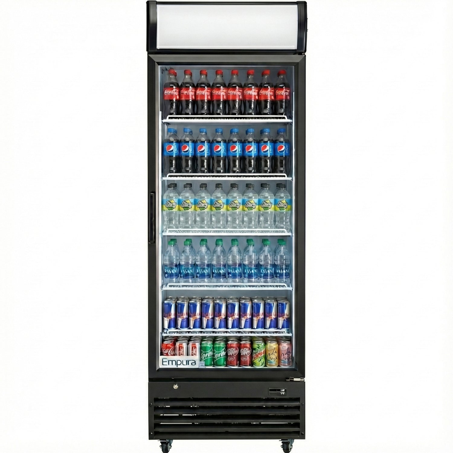 Empura, EGM-23B, Refrigerated Merchandiser, 27.56"W x 31.1"D x 81.02"H, 21 cu. ft. capacity, (1) glass swing door, (5) shelves, baked enamel steel black exterior and white interior, 32-50 F temperature range, 1/10 HP back compressor, 880 btu/h, R290 CFC-free refrigerant, electronic thermostat, digital LED temperature display, foamed-in place high density CFC-free polyurethane insulation, 2.78 amps, US plug type, 110v/60Hz/1ph, ETL, ETL Sanitation, cETLus, Tested and conforms to NSF-7 Standards, Empura Refrigeration