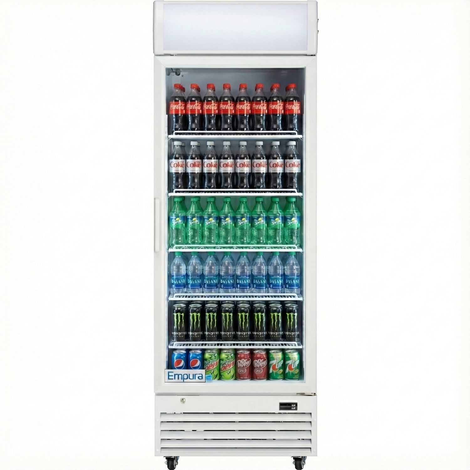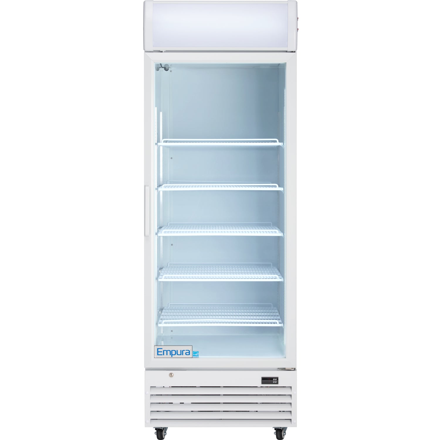 Empura, EGM-23W, Refrigerated Merchandiser, 27.56"W x 31.1"D x 81.02"H, 21 cu. ft. capacity, (1) glass swing door, (5) shelves, baked enamel steel white exterior and interior, 32-50 F temperature range, 1/10 HP back compressor, R290 CFC-free refrigerant, 880 BTU/h, electronic thermostat, digital LED temperature display, foamed-in place high-density CFC-free polyurethane insulation, 2.78 amps, US plug type, 110v/60Hz/1ph, ETL, ETL Sanitation, cETLus, Tested and conforms to NSF-7 Standards, Empura Refrigeration