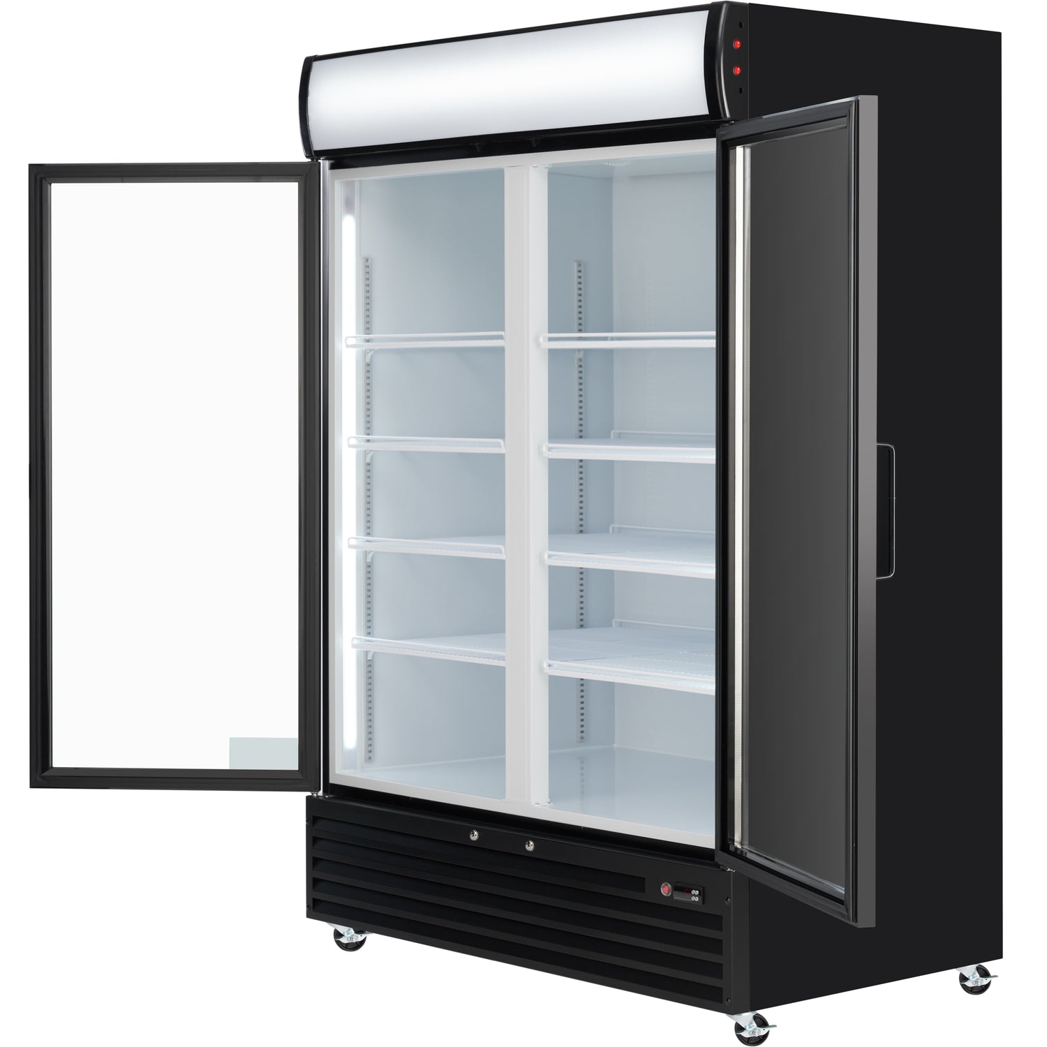 Empura, EGM-50B, Refrigerated Merchandiser, 52.36"W x 32.28"D x 79.65"H, 48 cu. ft. capacity, (2) glass swing doors, (8) shelves, baked enamel steel black exterior and white interior, 32-50 F temperature range, 1/7 HP back compressor, 1,276 btu/h, R290 CFC-free refrigerant, electronic thermostat, digital LED temperature display, foamed-in place high density CFC-free polyurethane insulation, 3.3 amps, US plug type, 110v/60Hz/1ph, ETL, ETL Sanitation, cETLus, Tested and conforms to NSF-7 Standards, Empura Refrigeration