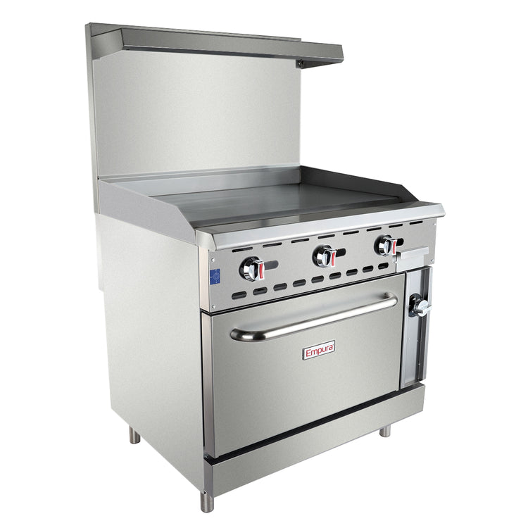 Empura, EGR-36GT, Range, 36" Restaurant, Gas, 35.98"W x 25.75"D x 56.69"H, gas griddle top with oven, U shape griddle burner with 21,000 btu/hr for NG and 23,000 btu/hr for LPG, thermostat (250- 550) controlled oven, 36 " x 22" griddle plate(5/8" thickness) with splash guard, adjustable heavy duty legs, oil collector with handle, U shape oven burner with 30,000 btu/hr, 34" npt rear gas connection, thermal coupling safety valve for the oven, stainless steel oven door with good insulation, stainless steel handle for bottom oven, welded frame structure for best stability, allows switching gas compatibility between natural gas and liquid propane(vice-versa), stainless steel front, galvanized sides, kick plate at the bottom for easy access for servicing, ETL, ETL Sanitation, cETLus, Tested and conforms to NSF/ANSI Std. 4, Empura Equipment