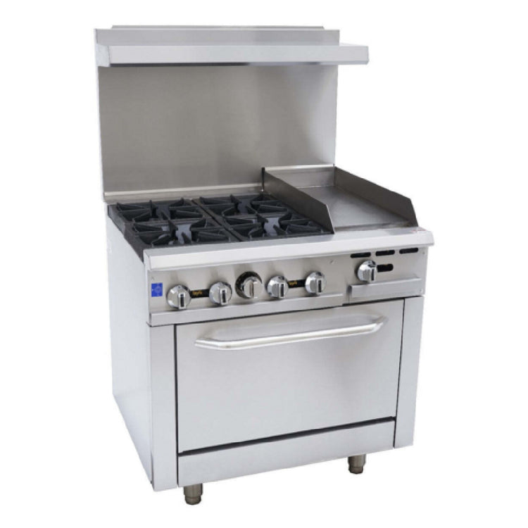 Empura, EGR36-G12_LP, Single Base Gas Range, liquid propane, 36"W x 32-5/8"D x 60-1/8"H, freestanding installation, 1 standard oven range base and included 2 racks with 12" right griddle, 250-550F oven temperature range, 10-1/8" stainless steel top shelf, 21-3/4" stainless steel backsplash, 6" stainless steel adjustable plate mounted legs, 171,000 total BTU, 3/4" rear national pipe thread gas connection, field conversion kit to liquid propane gas included, ETL, ETL Sanitation, cETLus, Tested and conforms to NSF/ANSI Std. 4, Empura Equipment