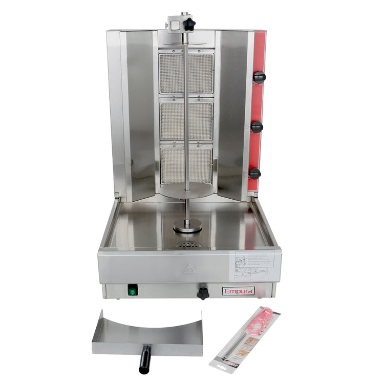 Empura, EGVB-65, Vertical Broiler (Gyro), Gas, 21"W x 23"D x 30"H, heavy duty motors, individually controlled infrared burners, power up to 9,500 btu for NG and 8,000 btu for LPG, stainless steel heat shield on both sides, 1/2" npt rear gas connection, distance can be adjusted between cooking spit and burners, continuous pilot for instant ignition of main burner, stainless steel oil collector, designed for high performance and consistent results, allows switching gas compatibility between natural gas and liquid propane(vice-versa), stainless steel structure, ETL, ETL Sanitation, cETLus, Tested and conforms to NSF/ANSI Std. 4, Empura Equipment