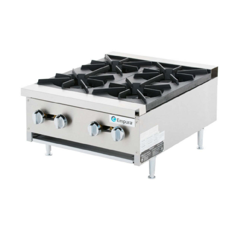 Empura, EMHP4-HD, Heavy Duty Gas Hot Plate, 24"W x 29-3/8"D x 13-1/8"H, with 12" X 12" cast iron top grates, countertop installation, 4 manual controllers, 4" stainless steel adjustable plate mounted legs, 120,000 total BTU, 3/4" rear national pipe thread gas connection, field conversion kit to liquid propane gas included, ETL, ETL Sanitation, cETLus, Tested and conforms to NSF/ANSI Std. 4, Empura Equipment