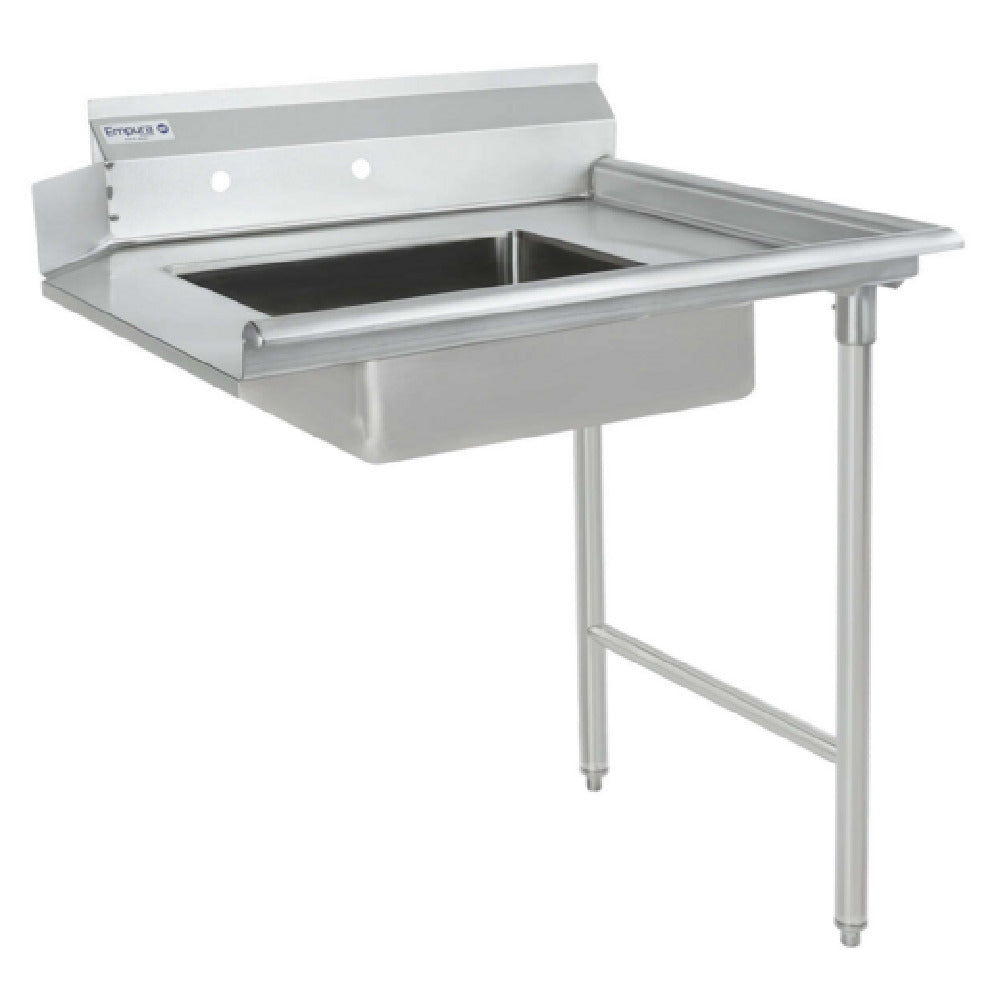 Empura, ESDT36R, Soiled Dishtable, 36"W x 30"D x 41.5"H, straight design, 16 gauge 304 stainless steel worktop, 7.5" backsplash, pre-rinsebowl on left, pre-rinsebowl 20"D x 20"W x 5"H, 3.5" drain basket included, all stainless steel structure (gussets/legs/cross braces/adjustable bullet feet), legs on right side, NSF, Empura Stainless