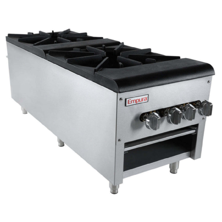 Empura, ESP-2, Stock Pot Range, natural gas, 18"W x 49-1/4"D x 20-1/2"H, countertop installation, 2 burners with 4 manual controllers (2 for each burner), 4" stainless steel adjustable plate mounted legs, 220,000 total BTU, 3/4" rear national pipe thread gas connection, field conversion kit to liquid propane gas included, ETL, ETL Sanitation, cETLus, Tested and conforms to NSF/ANSI Std. 4, Empura Equipment