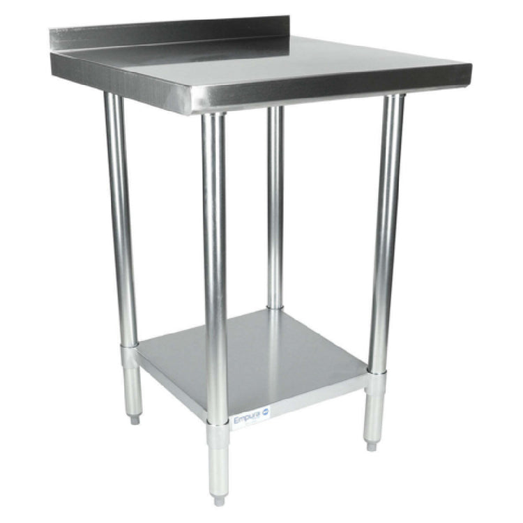Empura, EWT2B2424, Work Table, 24"W x 24"D x 35"H, economy duty, 2 inch backsplash, plastic adjustable bullet feet, galvanized steel 1-5/8" diameter leg, galvanized steel hat channel, 18 gauge under shelf, galvanized steel under shelf, 18 gauge top shelf, 430 stainless steel top shelf, NSF, Empura Stainless