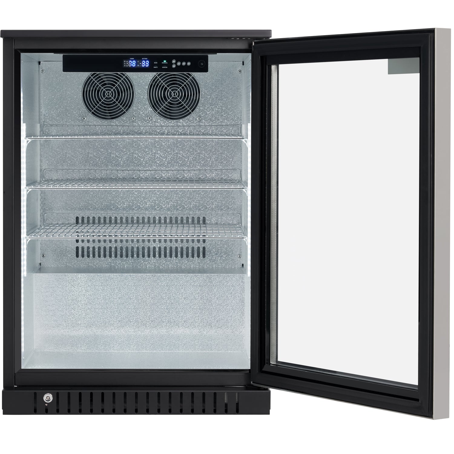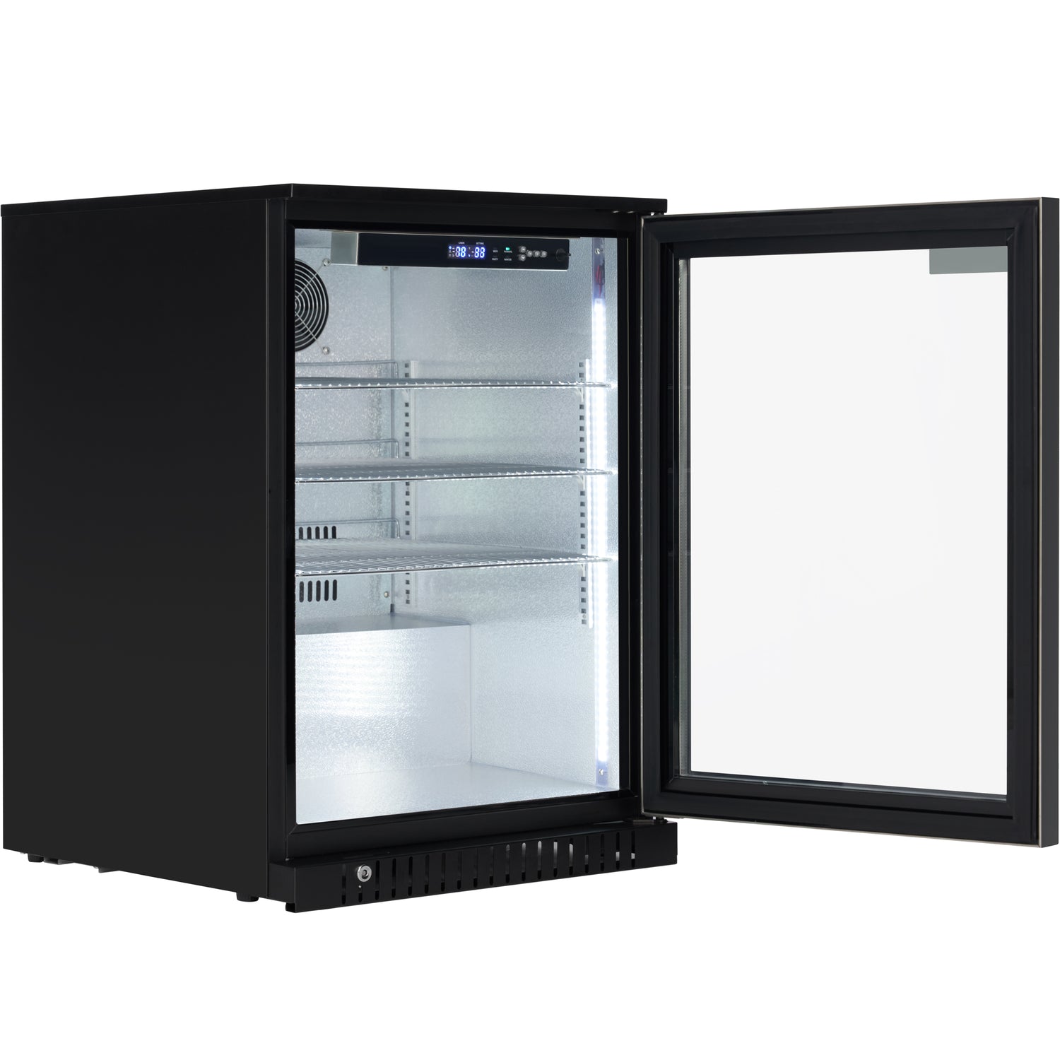 Empura, LG-E150-B, Refrigerator, Merchandiser, Undercounter, 23.62"W x 25.39"D x 33.86"H, 5.5 Cubic ft, black baked enamel steel finish exterior, embossed aluminum interior, LED interior lighting, 1 double-pane locking self-closing glass door, 3 heavy-duty polyethylene chrome shelves, electronic thermostat, Digital LED temperature display, CFC free refrigerant: R600a, 26 to 50 degrees F, Foamed-in place high density CFC-free polyurethane insulation, cooling system designed and suitable for outdoor use, 115 Volts, 60 Hz, 1-phase and 1.5 Amps for 1/10 HP, NEMA-5-15P plug, ETL, ETL Sanitation, cETLus, Tested and conforms to NSF-7 Standards, Empura Refrigeration