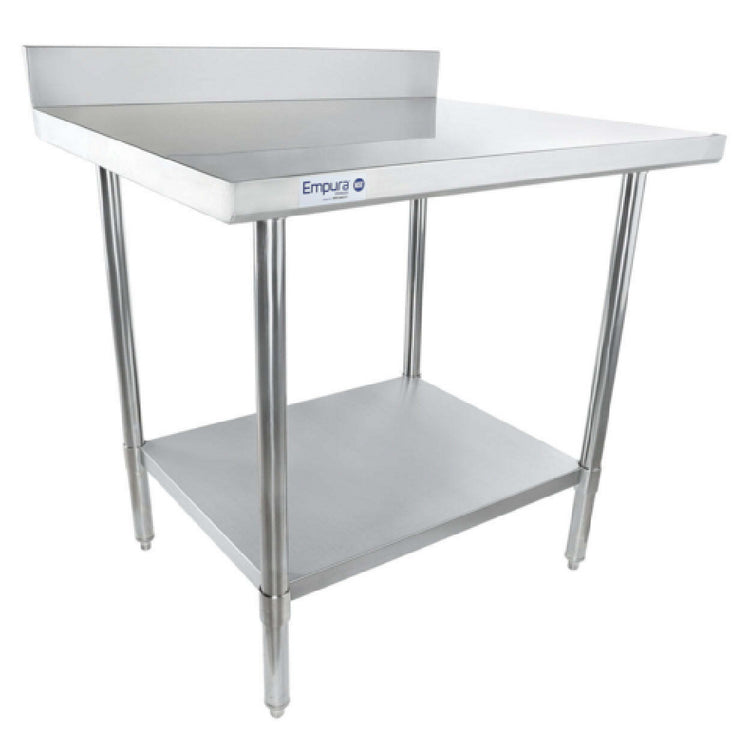 Empura, SWT4B3036, Work Table, 36"W x 30"D x 35"H, super duty, 4 inch backsplash, stainless steel adjustable bullet feet, stainless steel 1-5/8" diameter leg, stainless steel hat channel, 18 gauge under shelf, 430 stainless steel under shelf, 16 gauge top shelf, 304 stainless steel, top shelf, NSF, Empura Stainless
