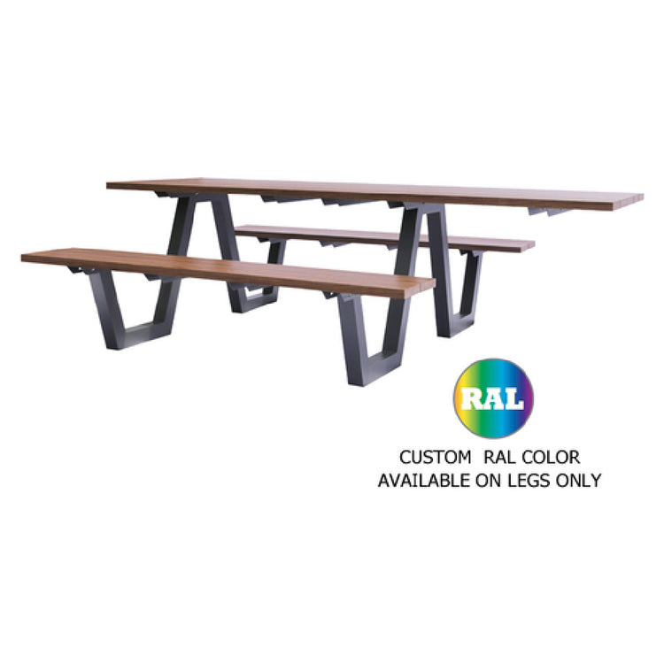 Emuamericas Llc A1821ARAL Sid Picnic Table is a versatile piece of furniture designed for both outdoor and indoor settings. Measuring 70 inches by 96 inches by 30 inches in overall dimensions, it features a 32-inch by 96-inch rectangular top, which provides ample space for gatherings or personal use. The table is constructed with a slatted wood-look aluminum top, offering durability with an aesthetic appeal that mimics traditional wood. It comes with two accompanying benches, enhancing its functionality for group seating. Designed with square aluminum legs, this picnic table offers stability and strength, making it a suitable choice for various environments, from residential patios to commercial spaces. The table is ADA compliant, ensuring accessibility for all users. Assembly is required upon purchase, allowing for convenient transportation and storage. Additionally, the option for a custom RAL color provides a degree of personalization, making it adaptable to different design preferences and settings. This table serves as a practical and stylish solution for those seeking a high-quality, adaptable piece of furniture for communal activities.