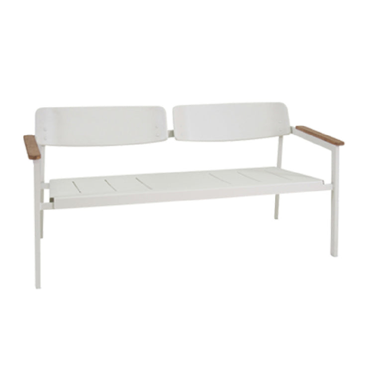 The Emuamericas LLC E260 Shine Loveseat is a versatile piece of furniture designed for both outdoor and indoor use, measuring 58 inches in length. This loveseat boasts a slat seat and solid back, providing a sturdy and comfortable seating solution. The inclusion of teak armrests adds a touch of elegance and warmth, enhancing the overall aesthetic appeal. Built with square tube legs, the loveseat ensures stability and durability in various environments. Made from aluminum and finished with a powder coat, it offers excellent resistance to weather elements, making it a reliable choice for outdoor settings. The PVC foot caps protect flooring surfaces and contribute to the longevity of the product. This loveseat is particularly suitable for residential patios, commercial outdoor spaces, and even indoor lounges, catering to different market segments. With its combination of stylish design and practical features, the Emuamericas LLC E260 Shine Loveseat provides a unique value proposition by blending functionality and aesthetics in one cohesive unit. Ideal for those seeking a durable and elegant seating option, this loveseat stands out as a versatile addition to any space, aligning with diverse consumer needs within the furniture industry.