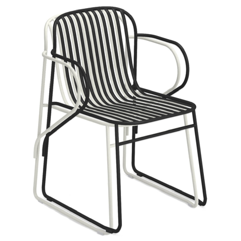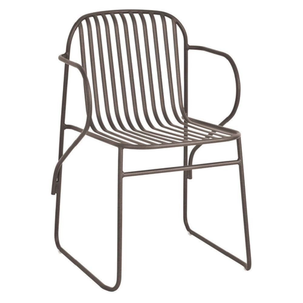 The Emuamericas Llc E435 Riviera Stacking Armchair is a versatile seating solution crafted for both outdoor and indoor settings, showcasing a refined blend of style and durability. This chair features a slatted wrought iron back and seat, providing a classic yet contemporary design that suits various aesthetic preferences. The robust steel frame is complemented by an e-coated powder coat finish, which enhances its resistance to weather conditions and ensures long-lasting use. Designed by the renowned duo Lucidi/Pevere, this armchair seamlessly integrates functionality with elegance, making it suitable for a wide range of environments, from commercial spaces like cafes and restaurants to residential patios and dining areas. The stackable design offers practical space-saving benefits, allowing for easy storage and organization in crowded or limited spaces. With its thoughtful construction and modern design elements, the Emuamericas Llc E435 Riviera Stacking Armchair represents a distinctive choice for individuals and businesses looking to enhance their seating arrangements with a product that delivers both style and substance.