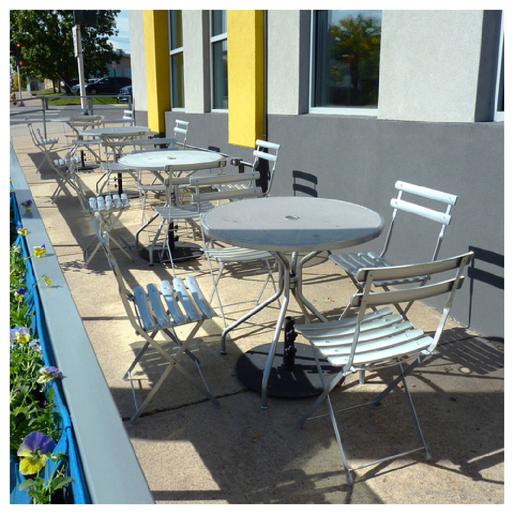 The Emuamericas LLC E803-22 Cambi Table with Umbrella Hole Round is a versatile piece designed for both outdoor and indoor use, featuring a round top with a diameter of 32 inches and a height of 29-1/2 inches. The table showcases a mesh top that offers a modern aesthetic while facilitating airflow and water drainage, making it ideal for various weather conditions. Constructed with e-coated steel, the table provides enhanced durability and resistance to corrosion, which is further strengthened by a powder-coated finish that adds a layer of protection against the elements. Its tubular steel legs ensure robust support and stability, accommodating different usage scenarios from casual dining to upscale events. The inclusion of PVC foot caps, including one adjustable cap, allows for stability on uneven surfaces, enhancing the table's practicality in diverse settings such as patios, cafes, or garden areas. The central umbrella hole adds functionality, offering users the option to integrate shade solutions for comfort during sunny days. As a best seller, this table meets high standards of quality and resilience, making it a preferred choice across various market segments within the hospitality and residential outdoor furniture industry.