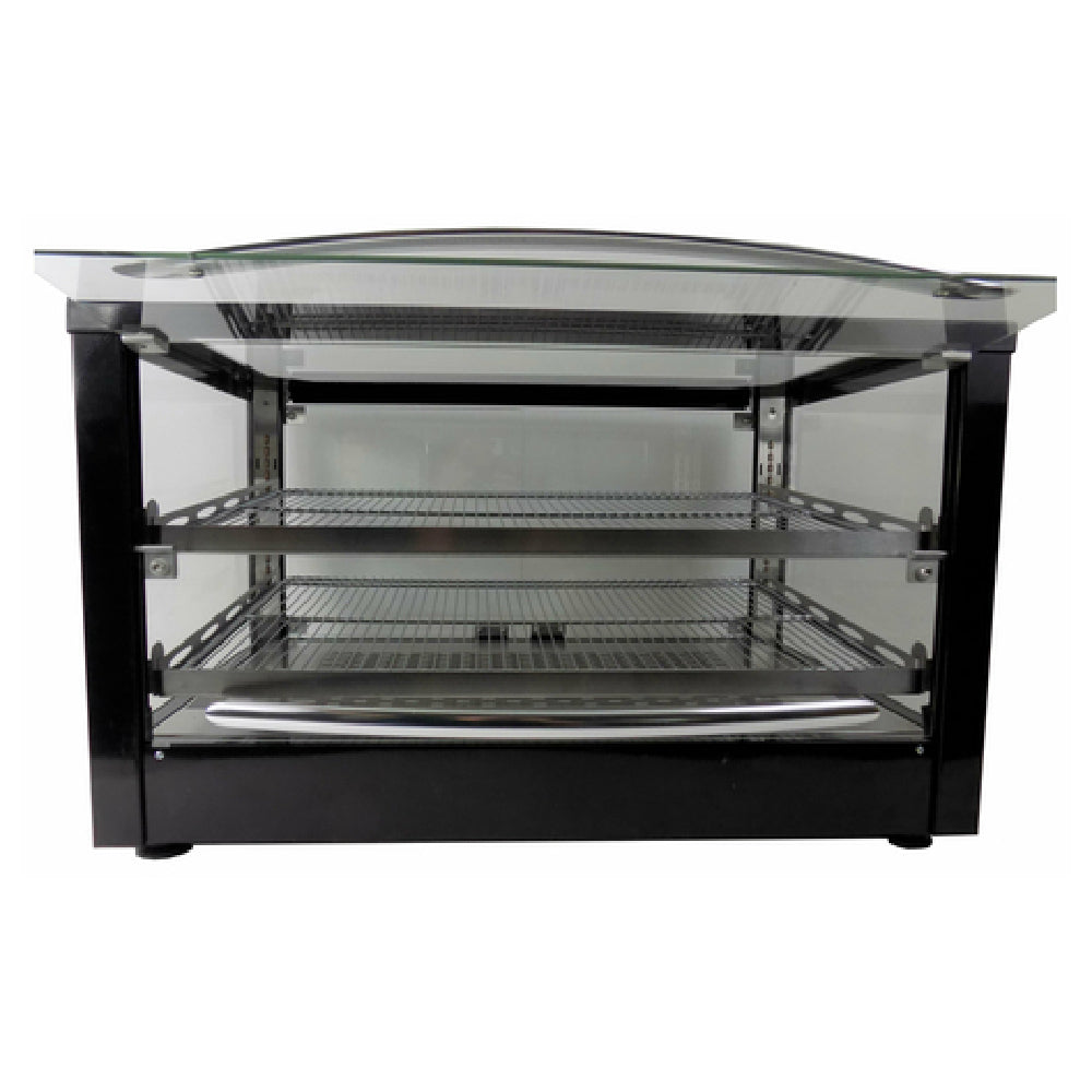 Equipex LLC, WD780B-2/1-SS/SL, Roller Grill Warming Display, 2-tier, (2) horizontal self-service doors on customer side, 108 degrees hinged glass doors on operators side, includes: (2) shelves & (2) sets of slanted shelf brackets w\ front stops, accommodates (2) full size sheet pans (by others), fully panoramic, ventilated firestone heating system, 68 - 194° F, electronic thermostat, humidity control, LED interior lighting, 180 degrees hinged glass doors, fixed glass front & sides, stainless steel interior & black exterior frame, 120v/60/1-ph, 1.75kW, 15.0 amps, NEMA 5-15P, cULus, cULus Classified