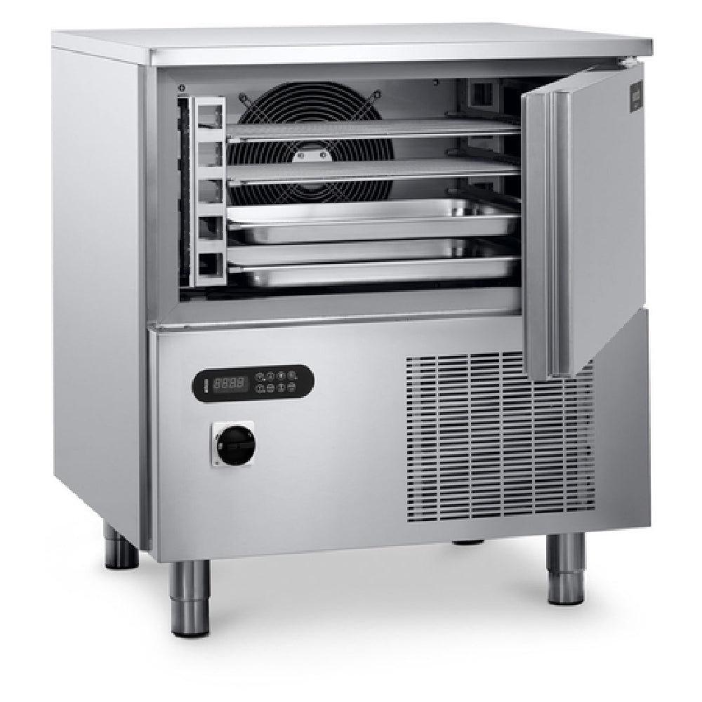 Eurodib USA, BCB05US230, Gemm® Commercial Blast Chiller/Freezer, reach-in, single section, self-contained, (5) 18" x 26" pan capacity, 57 lb. capacity (chilling) or 35 lb. capacity (freezing), 197°F to 37°F chilling, 197° to 0°F freezing, auto defrost with pause, (1) solid hinged door, stainless steel interior & exterior, stainless steel adjustable legs, R404A, 1 HP, 1865 watts, 208-230v/60/1-ph, 10.5 amps, cord, NEMA 6-20P, cETLus, ETL-Sanitation, Made in Italy