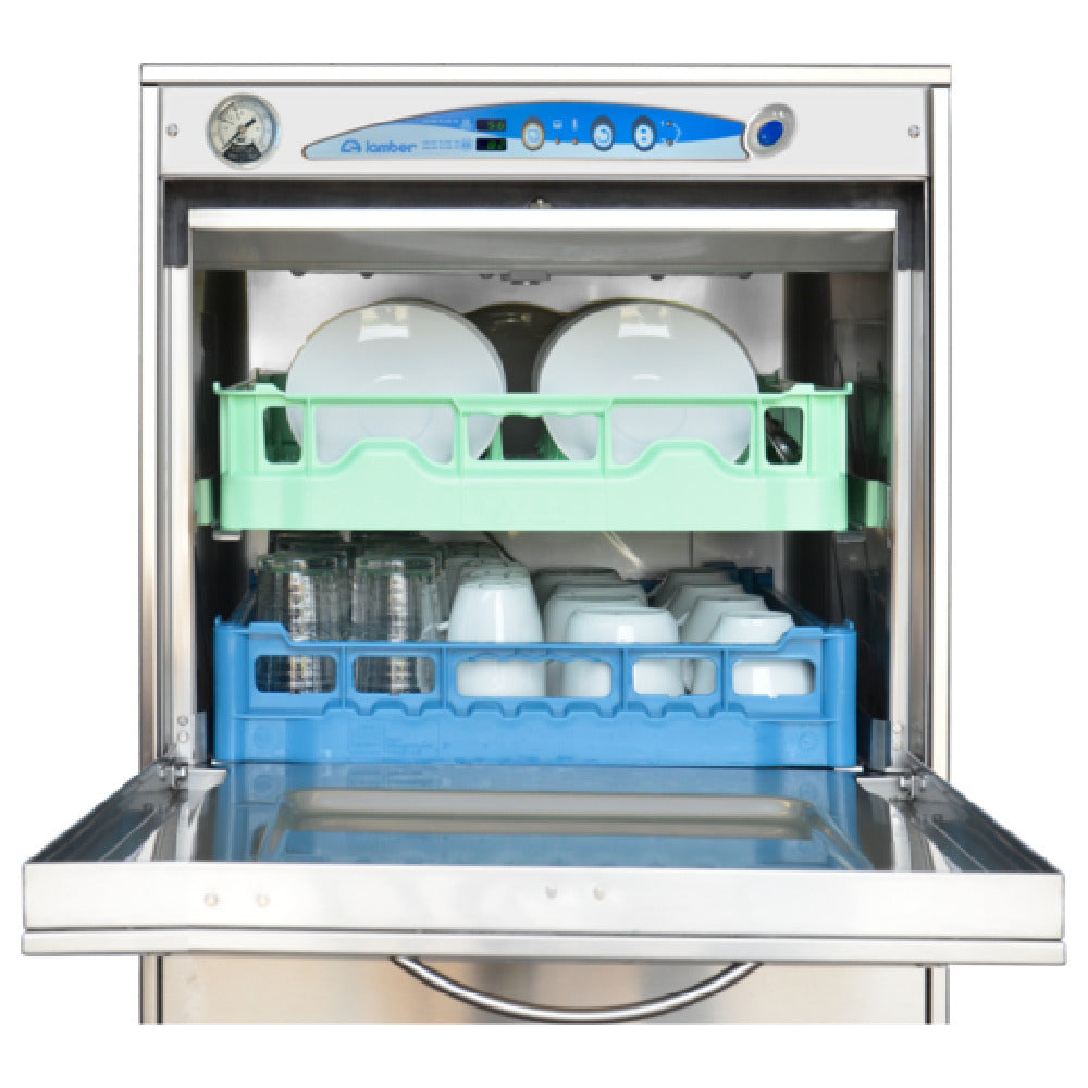 Eurodib USA, F99EKDPS, Lamber Dishwasher, high temp, undercounter, 14.57" clearance, (2-3-4) min. cycle, (30-20-15) racks/hour, double basket capacity, soft start, electronic control panel, rinse aid dispenser, detergent pump, drain pump, thermocontrol, security thermostat, tank drain unit with filter, (2) 20" x 20" baskets for dishes, (1) general basket, (2) cutlery baskets, (2) rail kits included, stainless steel, 208-240v/60/1-ph, 35 amps, 6.5kW, UL, cULus, ENERGY STAR®