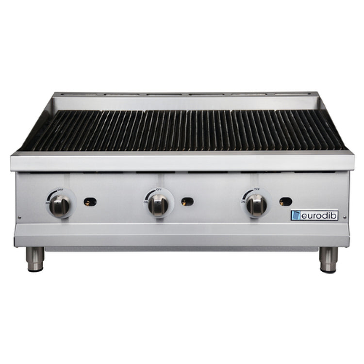Eurodib USA, TCBR36, Broiler, countertop, gas, 36" x 20" cooking surface, cast iron grates, (3) "U" shaped burners, manually controlled, burner safety valves, removable waste tray, stainless steel construction and finish, (4) adjustable feet, 120,000 BTU, cETLus, ETL-Sanitation