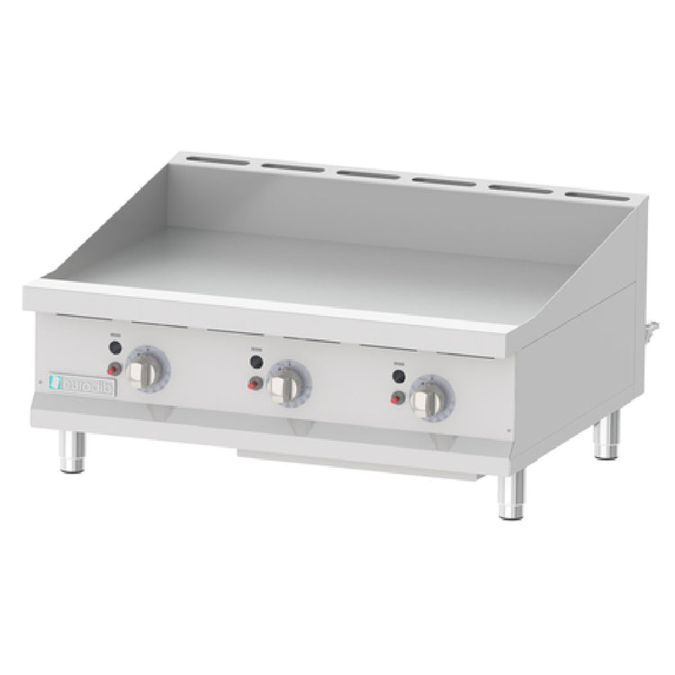 Eurodib USA, TG36T, Professional Griddle, gas, countertop, 36" x 20" polished cooking surface, thermostat controls (200°-575° temperature range), (3) "U" shaped burners, burner safety valves, removable waste tray, stainless steel construction, (4) adjustable feet, 90,000 BTU, ETL, ETL-Sanitation
