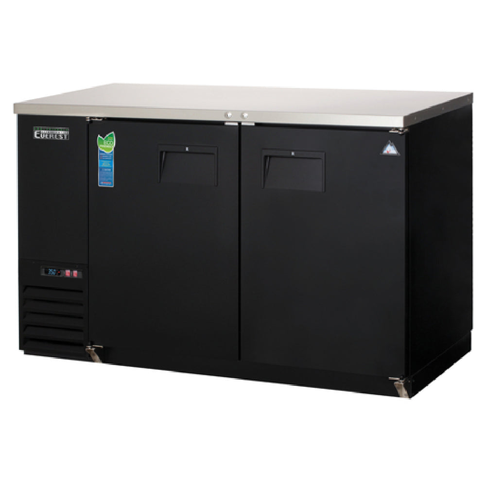 The Everest Refrigeration EBB59-24 Back Bar Refrigerator is a versatile two-section unit with a width of 57-3/4", designed to cater to various commercial needs. It boasts a substantial storage capacity of 17.0 cubic feet, capable of holding up to 560 12 oz. cans or 357 12 oz. bottles, making it ideal for bars and restaurants. The refrigerator features a self-contained side-mounted refrigeration system, utilizing the eco-friendly R290 Hydrocarbon refrigerant. Its robust construction includes a stainless steel countertop, two solid hinged locking doors, and four epoxy-coated wire shelves. The unit is equipped with digital controls with an LED display for precise temperature management and auto defrost functionality. Interior visibility is enhanced by LED lighting with an on/off switch. Externally, the refrigerator is finished with a textured and laminated black vinyl, while the interior walls are made from galvanized steel with a stainless steel floor for durability. Powered by a 1/4 HP motor, the unit operates on 115v/60/1-ph, drawing 3.5 amps, and comes with a NEMA 5-15P cord. It meets NSF, cETLus, and ETL-Sanitation standards, ensuring adherence to safety and sanitation requirements, making it a reliable choice for various market segments within the food service industry.