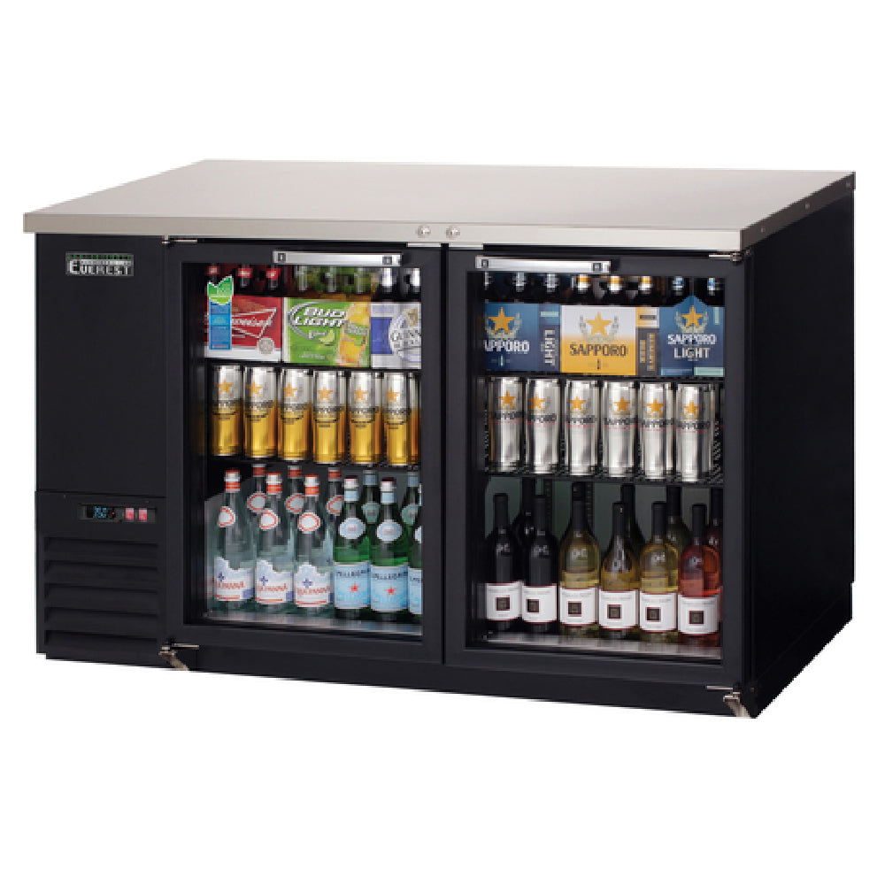 The Everest Refrigeration EBB59G-24 Back Bar Refrigerator is a two-section unit measuring 57-3/4"W with a generous 17.0 cu. ft. capacity. It is engineered to accommodate up to 560 12 oz. cans or 357 12 oz. bottles, making it a versatile choice for various segments of the hospitality and retail industry that require substantial beverage storage. The refrigerator features self-contained side-mounted refrigeration with a robust stainless steel countertop, enhancing durability and aesthetic appeal. It includes two glass hinged doors with locking mechanisms to ensure secure storage. Inside, four epoxy-coated wire shelves provide ample storage flexibility. The unit is fitted with digital controls complemented by an LED display for precise temperature management and offers the convenience of auto defrost. The LED interior lighting, equipped with an on/off switch, ensures visibility while maintaining energy efficiency. Its exterior is crafted from textured and laminated black vinyl, while the interior walls are galvanized steel with a stainless steel floor, ensuring long-term reliability. This refrigerator uses R290 Hydrocarbon refrigerant, powered by a 1/4 HP motor operating at 115v/60/1-ph and 3.5 amps, complete with a NEMA 5-15P cord. Certified by NSF, cETLus, and ETL-Sanitation, it meets high standards of safety and sanitation.