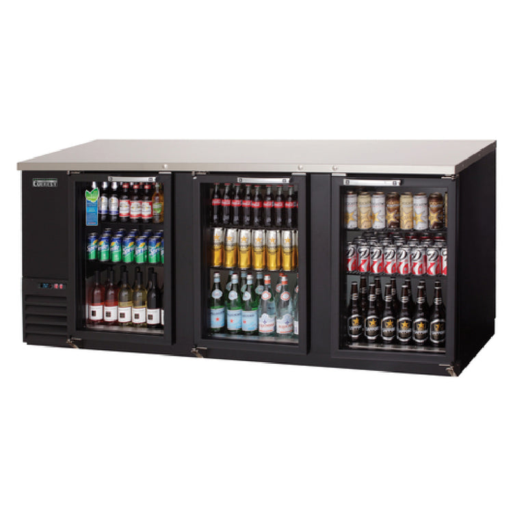 The Everest Refrigeration EBB90G-24 Back Bar Refrigerator is a three-section unit with an expansive width of 89-1/4 inches, offering a substantial storage capacity of 28.0 cubic feet. It is engineered to accommodate up to 980 12-ounce cans or 609 12-ounce bottles, making it a versatile solution for bars and restaurants that require efficient beverage storage in high-demand settings. This model features self-contained side-mounted refrigeration with R290 Hydrocarbon refrigerant, ensuring environmentally conscious operation. Designed with a sleek stainless steel countertop and a durable textured and laminated black vinyl exterior, this refrigerator is both functional and stylish. It includes three glass hinged doors with locking mechanisms for secure access and comes equipped with six epoxy-coated wire shelves for organized storage. The digital controls with an LED display offer precise temperature management, while the auto defrost function and LED interior lighting with an on/off switch ensure convenience and visibility. The interior walls are constructed from galvanized steel, complemented by a stainless steel floor, enhancing the unit's durability and ease of cleaning. Operating at 1/3 horsepower with a 115v/60/1-ph electrical rating and 2.5 amps, it uses a NEMA 5-15P plug. Certified by NSF, cETLus, and ETL-Sanitation, it meets rigorous standards for safety and sanitation.