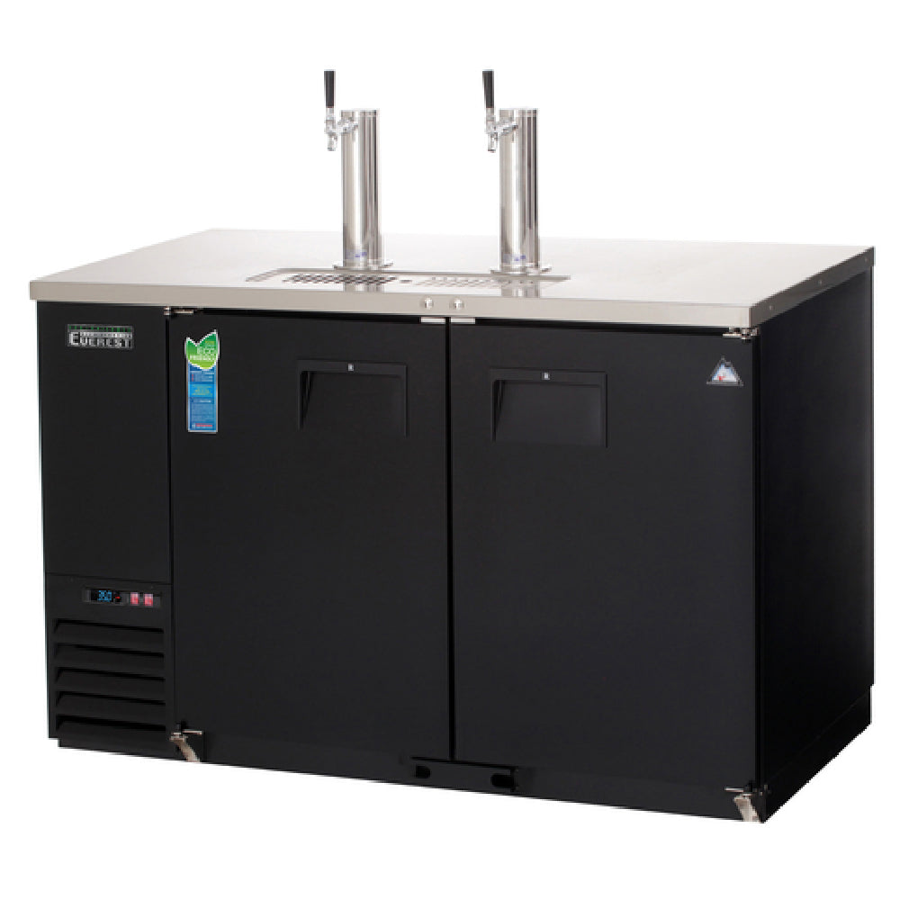 The Everest Refrigeration EBD2 Direct Draw Keg Refrigerator Two-section 57-3/4"W stands as a reliable solution for bars and restaurants requiring efficient beverage storage. With a generous 20.0 cu. ft. capacity, it accommodates two 1/2 barrel kegs, making it a valuable asset for establishments with significant draft demand. This model features self-contained side-mounted refrigeration, ensuring optimal cooling performance. Equipped with two solid hinged locking doors, this refrigerator provides secure storage. The unit includes two 3" diameter insulated stainless steel draft towers, each with a single faucet, supported by an air distributor for consistent beverage dispensing. The stainless steel countertop and galvanized steel interior walls with a stainless steel floor highlight its durable construction. Digital controls with an LED display allow for precise temperature management, complemented by an auto defrost system and LED interior lighting for enhanced visibility. The exterior is wrapped in textured and laminated black vinyl, offering a sleek, professional appearance. Designed with practicality in mind, it includes an exterior drain port for managing excess moisture, though a drain hose is not included, and requires a floor drain. Operating on R290 Hydrocarbon refrigerant, this unit is powered by a 1/4 HP motor, utilizing 115v/60/1-ph electricity with a 3.5-amp draw.
