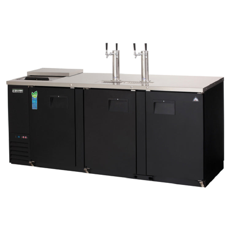 The Everest Refrigeration EBD4-CT Club Top Direct Draw Keg Refrigerator - three-section unit is engineered for high-performance beverage cooling, boasting an impressive 32.0 cu. ft. capacity within its expansive 89-1/4"W frame. Designed with a self-contained side-mounted refrigeration system, this unit efficiently accommodates (4) 1/2 barrel kegs. The robust design features (3) solid hinged locking doors and a convenient sliding club top lid for versatile access. Essential for draft beer service, it includes (2) 3" diameter insulated stainless steel draft towers, each equipped with (2) faucets, ensuring double-tap service. Constructed with a stainless steel countertop and lid, the refrigerator integrates digital controls with an LED display for precision temperature management and auto defrost functionality. Interior LED lighting enhances visibility, while the textured and laminated black vinyl exterior and galvanized steel interior walls ensure durability. The unit’s stainless steel floor includes an exterior drain port for moisture control, though a separate drain hose and floor drain are required. Operating on R290 Hydrocarbon refrigerant, with a 1/3 HP motor, the EBD4-CT runs on 115v/60/1-ph, drawing 2.5 amps with a NEMA 5-15P plug. NSF and cETLus certified, it is ideal for bars, restaurants, and event venues seeking reliable, high-capacity keg refrigeration.