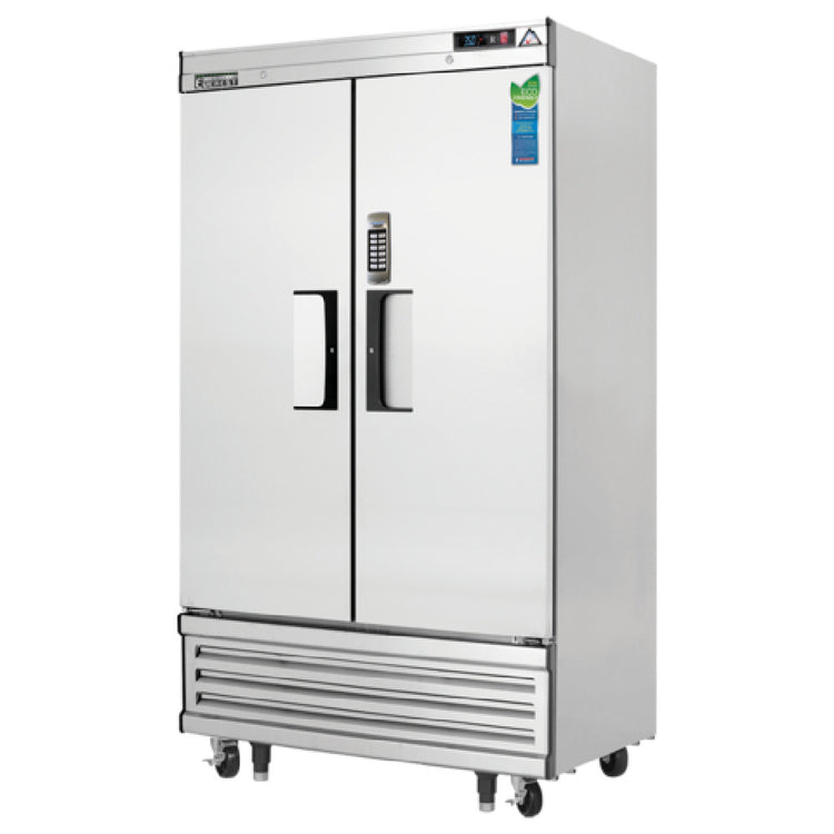 The Everest Refrigeration EBR2-LAB Laboratory Refrigerator is a precision-engineered, two-section unit designed for demanding laboratory environments. With a width of 54-1/8 inches and a capacity of 33.0 cubic feet, this refrigerator offers ample space for scientific storage needs. Its self-contained bottom mounted refrigeration system employs an efficient R290 Hydrocarbon refrigerant, powered by a 1/3 HP inverter compressor, ensuring consistent cooling performance. The unit operates on 115v/60/1-ph, drawing 1.8 amps, and includes a NEMA 5-15P power cord for easy installation. The refrigerator features two full-height, solid hinged doors that are self-closing and field reversible, complete with an electrol keypad lock for secure access. Inside, six epoxy-coated wire shelves with height adjustable clips provide customizable storage options, complemented by LED interior lighting for enhanced visibility. Temperature management is facilitated by digital controls with a clear LED display, while an auto defrost function maintains optimal operation. Constructed with a stainless steel interior and exterior front and sides, and a galvanized steel top, bottom, and rear, this refrigerator is built for durability. Mobility is assured with four 5-inch swivel casters, two of which are locking, and additional stability is provided by two leg stabilizers. Certified by cETLus and ETL-Sanitation, this unit meets rigorous safety and sanitation standards.