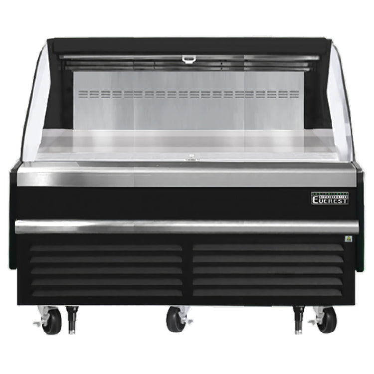 The Everest Refrigeration EOMH-60-B-35-S Horizontal Open Display Merchandiser is a versatile cooling solution designed to meet the diverse needs of various market segments within the food and retail industry. With dimensions of 60"W x 34-1/4"D x 41"H, this merchandiser offers a spacious 9.3 cubic feet capacity. The unit features a self-contained bottom mount refrigeration system with front air intake and rear air discharge, ensuring efficient cooling performance. It is equipped with LED lighting in the canopy and underneath the shelves, providing excellent product visibility. The retractable night curtain aids in energy preservation. A 2-tier stainless steel shelf riser enhances display options, and the stainless steel interior ensures durability. The black exterior offers a sleek aesthetic appeal. The merchandiser is fitted with 5" front swivel casters with locks and leg stabilizers for stability and mobility. Using the environmentally friendly R290 Hydrocarbon refrigerant, the unit is powered by two 1/2 HP motors, operating at 115v/60/1-ph and 10.0 amps. The inclusion of features like an overheat protection alarm adds to its reliability. Certified by ETL-Sanitation, cETLus, and NSF, this merchandiser is a trusted choice for maintaining high standards in food safety and energy efficiency.