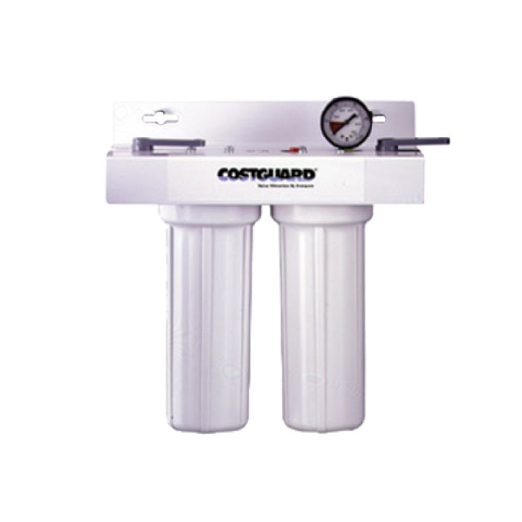 The Everpure EV910012 EverpureĀ® Water Filter Housing CGS-12 is a high-performance water filtration solution designed to cater to various market segments within the water purification industry. This product includes two CGS-10 10" low profile water filter housings, making it suitable for compact installations where space savings are crucial. Featuring a mounting bracket for easy installation, it ensures stability and reliability in different settings. The integrated water pressure gauge allows for precise monitoring of pressure levels, ensuring optimal performance and safety. A pressure relief button is included to facilitate convenient maintenance and filter changes. The system operates at a flow rate of 4.0 gallons per minute, efficiently accommodating the needs of small to medium-sized facilities. With both a 1/2" inlet and a 1/2" outlet, the Everpure EV910012 is compatible with standard plumbing connections, ensuring seamless integration into existing water systems. This product is ideal for commercial and residential applications where high-quality water filtration is essential, delivering reliable and efficient service through its robust design and comprehensive features.