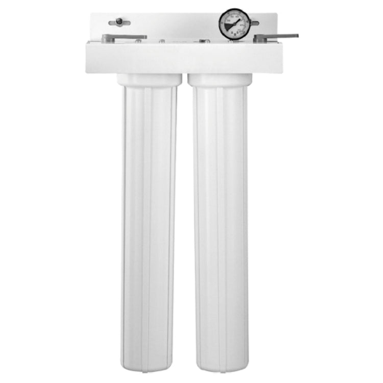 The Everpure EV910022 Everpure® Water Filter Housing CGS-22 (2) CGS-20 20" Low Profile Water Filter Housing is a highly efficient solution designed for use in various commercial applications. This product features a set of two CGS-20 water filter housings, each with a low-profile 20-inch design, which ensures space-saving installation and compatibility with a range of water filtration systems. Equipped with a mounting bracket, it provides secure and stable placement, essential for high-demand environments. The unit includes a water pressure gauge, allowing for precise monitoring of system performance, and a pressure relief button to facilitate easy maintenance and ensure optimal functionality. With a flow rate of 4.0 gallons per minute (gpm), it is optimal for medium-flow applications. The 1/2-inch inlet and outlet connections ensure seamless integration into existing piping systems. The Everpure EV910022 is meticulously engineered to meet the industrial standards required by the food and beverage sector, healthcare facilities, and hospitality industries, delivering superior water quality and operational efficiency. Its robust construction and thoughtful design make it a reliable choice for professionals seeking advanced water filtration solutions, ensuring consistent performance and high levels of customer satisfaction.