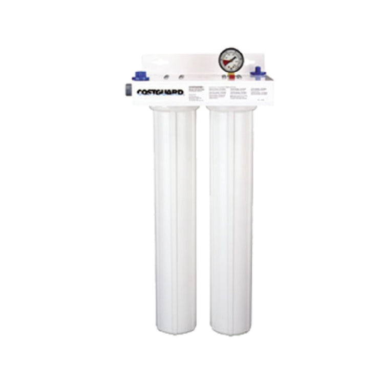 The Everpure EV910023 EverpureĀ® Water Filter Housing CGS-23 (2) CGS-20 20" Low Profile Water Filter Housing combines advanced filtration technology with practical design features to meet various industry needs. This model includes two CGS-20 20-inch low-profile water filter housings, making it suitable for compact installations where space is at a premium. It features a mounting bracket, ensuring easy and secure installation in diverse settings. The system operates efficiently with a flow rate of 4.0 gallons per minute (gpm), and its 3/8-inch inlet and outlet connections are designed for seamless integration with existing water systems. A water pressure gauge is included for monitoring system performance, while a pressure relief button allows for safe and easy maintenance. This water filter housing is engineered to deliver reliable performance in demanding environments, providing clean and safe water for various applications. Its robust construction and efficient operation make it a preferred choice for both commercial and residential sectors that require consistent water quality, demonstrating Everpure's commitment to quality and innovation in water filtration solutions.