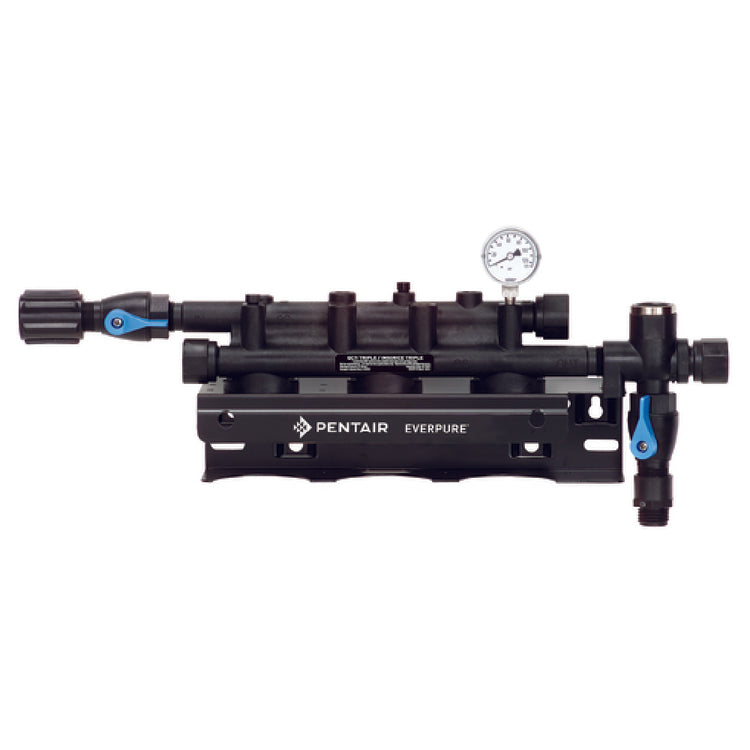 The Everpure EV927223 QC7I Water Filtration System Head - QC7I Triple - (1) QC7I Triple Head Assembly is engineered for precision and efficiency in water filtration across various industry segments. This system incorporates a QC7I Triple Head Assembly designed to support multiple filters simultaneously, enhancing filtration capacity and reliability. A built-in water shut-off valve ensures straightforward maintenance and filter replacement without disrupting water supply, adding convenience and operational efficiency. The system features a water pressure gauge, offering real-time monitoring of water pressure levels, which is crucial for ensuring optimal performance and preventing damage. Its 3/4" inlet and 3/4" outlet connections facilitate a robust flow rate while maintaining compatibility with standard plumbing systems. The included mounting bracket ensures a secure installation, simplifying setup and integration into existing systems. The Everpure EV927223 is ideal for applications requiring consistent and high-quality water filtration, making it a valuable component for foodservice operations, commercial kitchens, and any setting where water purity is paramount. This filtration system head stands out with its comprehensive features and reliable build, providing a tailored solution that meets the rigorous demands of different market segments within the water filtration industry.
