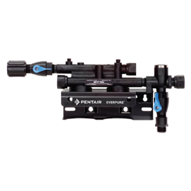 The Everpure EV927227 QC7I Water Filtration System Head QC7I Twin is a sophisticated filtration head assembly designed for high-efficiency water filtration systems. This product includes one QC7I Twin Head Assembly, which is integral for systems requiring dual filtration capabilities. It comes complete with a mounting bracket, facilitating easy and secure installation. A notable feature of this assembly is its built-in water shut-off valve, providing convenience and safety by allowing users to easily stop the water flow without disconnecting the system. The system head is outfitted with 3/4-inch inlet and outlet ports, ensuring compatibility with various plumbing setups. This configuration is particularly beneficial for commercial kitchens, hospitality venues, and other sectors requiring large volumes of filtered water. The technical design of the Everpure EV927227 ensures reliable performance and longevity, making it a preferred choice for businesses seeking to maintain high water quality standards. Its robust construction and user-friendly features cater to the demanding needs of the food and beverage industry, healthcare facilities, and other professional environments where water quality is critical. By incorporating advanced engineering with practical usability, the QC7I Twin Head Assembly stands out as an essential component for effective water filtration systems.