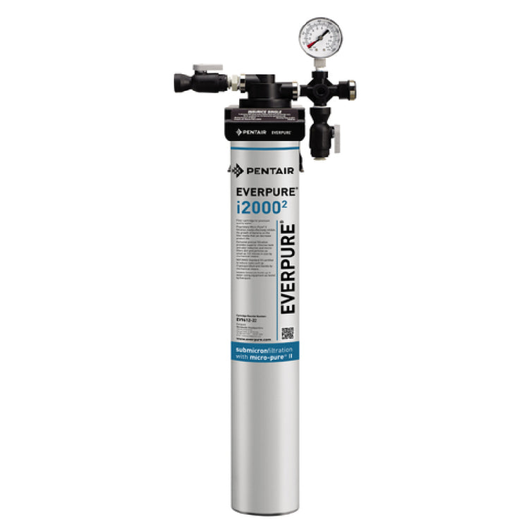 The Everpure EV932401 Insurice® Water Filtration System - Insurice® Single-i2000² is a highly efficient solution designed for the food and beverage industry, particularly beneficial for those aiming to enhance water quality and equipment longevity. This system features the i2000² Micro-Pure® II Precoat primary filtration cartridge, which effectively reduces chlorine, taste, and odor, ensuring a superior water experience. A key advantage is its ability to inhibit scale, significantly extending the lifespan of ice machines and other equipment. The unit includes an outlet pressure gauge and a flushing valve, enhancing user control and maintenance ease. With a capacity of 9,000 gallons and a flow rate of 1.67 gallons per minute, it is built to handle substantial water filtration demands. The filtration system operates with a 0.5-micron rating, ensuring comprehensive removal of particulates. It is designed with 3/8-inch inlet and outlet connections, facilitating smooth integration into existing setups. Certified under NSF 42 and 53, the Everpure Insurice® Single-i2000² meets rigorous standards for public health and safety. This model is an ideal choice for businesses looking to maintain high-quality water standards, optimize equipment performance, and ensure customer satisfaction in their operations.