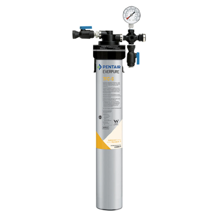 The Everpure QC7I SINGLE 7FC-S QC7I Water Filtration System is a high-performance filtration solution designed to meet the rigorous demands of various industry segments. This system is equipped with a single 7FC-S Fibredyne® carbon block cartridge, which is instrumental in reducing contaminants like sediment, chlorine, taste and odor, cysts, and turbidity, while also inhibiting scale buildup. With a substantial capacity of 25,000 gallons, this filtration system ensures long-lasting performance and efficiency. It operates at a flow rate of 2.5 gallons per minute and features a fine filtration capability of 0.2 microns, making it an ideal choice for environments that require precise water quality management. The system includes an inlet water shut-off valve and an outlet pressure gauge, facilitating easy monitoring and maintenance. Additionally, the flush valve and 3/8" inlet/outlet connections enhance its operational convenience. Certified to meet NSF 42 and NSF 53 standards, the Everpure QC7I SINGLE 7FC-S ensures compliance with stringent health and safety regulations. The product code for this system is EV920291, signifying its place in Everpure's lineup of reliable and effective water filtration solutions. This system is particularly valuable for food and beverage services, healthcare facilities, and any setting where water quality is paramount.