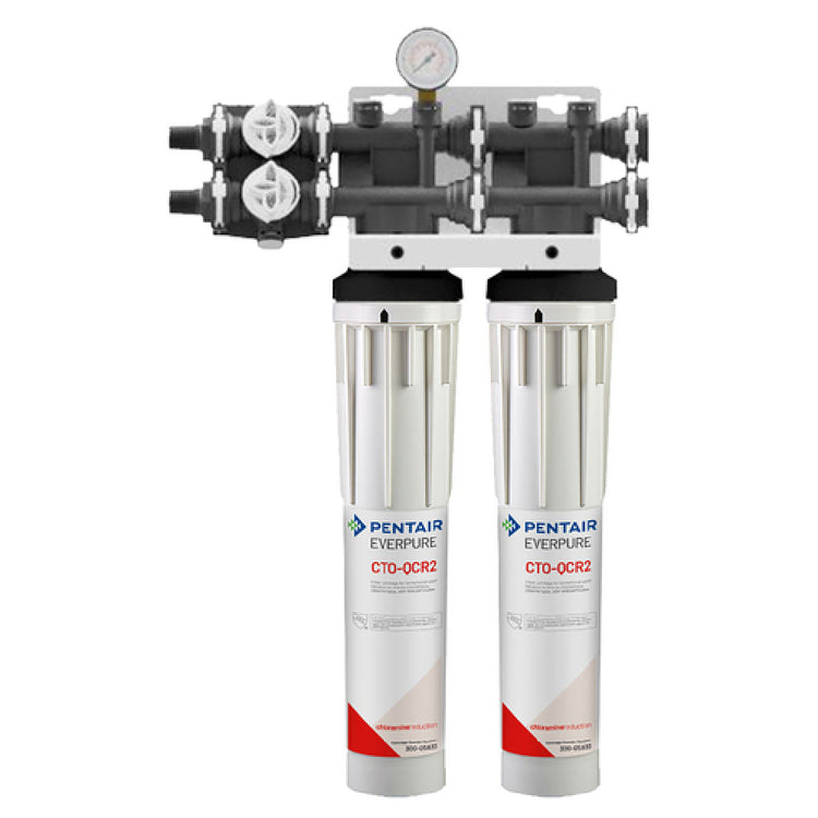 The Everpure QTCR-2 Water Filter System Twin (2) CTO-QCR2 Activated Carbon Cartridge is a highly efficient water filtration solution designed for diverse industry needs, particularly in environments requiring significant water treatment capabilities. This system features two CTO-QCR2 activated carbon cartridges that effectively reduce chlorine, chloramine, and sediment, ensuring cleaner and safer water. With a capacity of 20,000 gallons, it is well-suited for high-demand settings. The system operates at a flow rate of 3.4 gallons per minute (gpm) and utilizes a 5-micron filtration level, providing precise particulate removal. Featuring an outlet pressure gauge, it allows for easy monitoring of system performance. The inclusion of a water shut-off valve and a bypass valve ensures flexibility and convenience during maintenance or cartridge replacement. Installation is simplified with the accompanying mounting bracket. The system is equipped with 1/2 inch inlets and outlets, making it compatible with standard plumbing configurations. Certified by NSF 42, it adheres to stringent safety and quality standards, ensuring reliable performance. This comprehensive filtration system is ideal for commercial applications, delivering exceptional water quality with a focus on efficiency and user convenience.