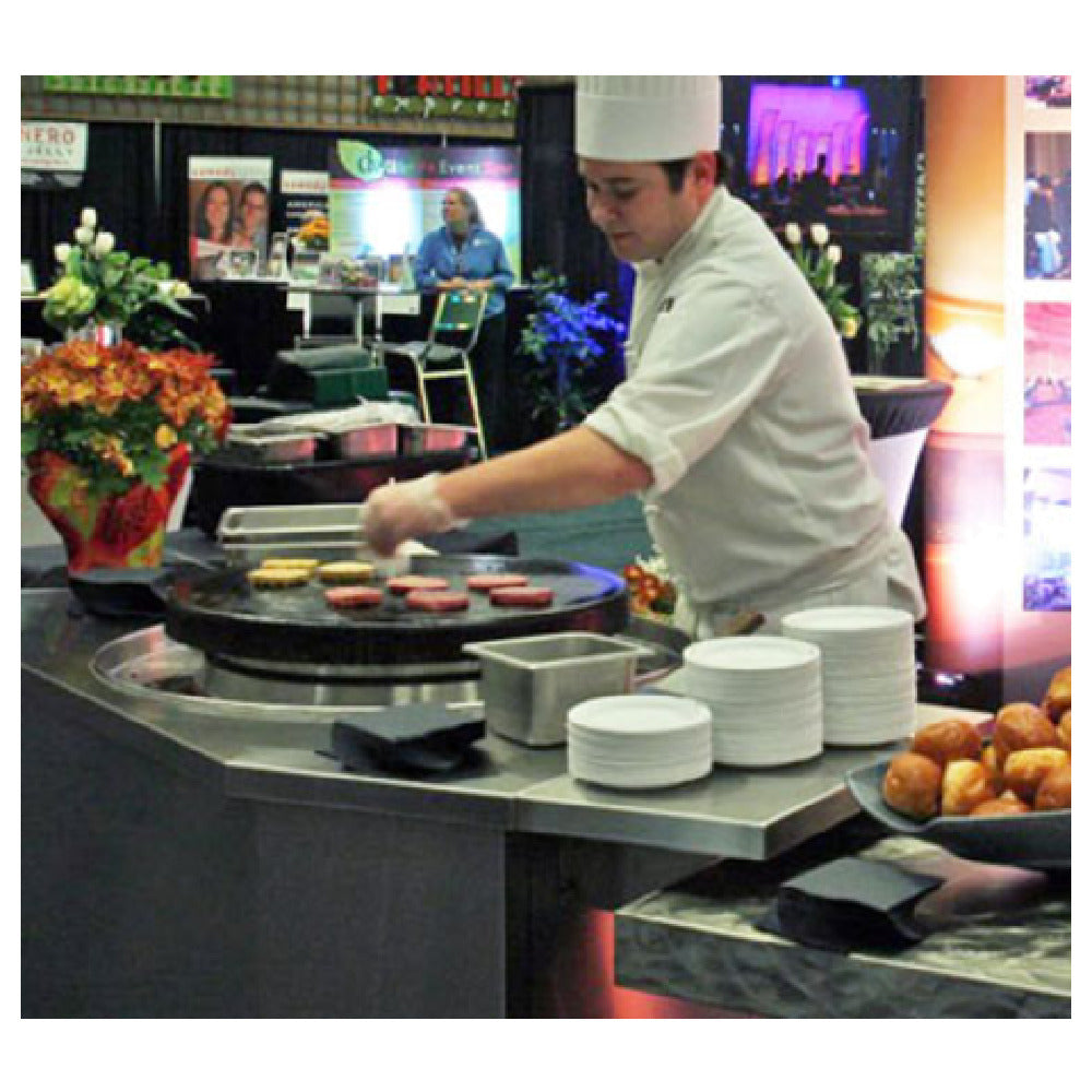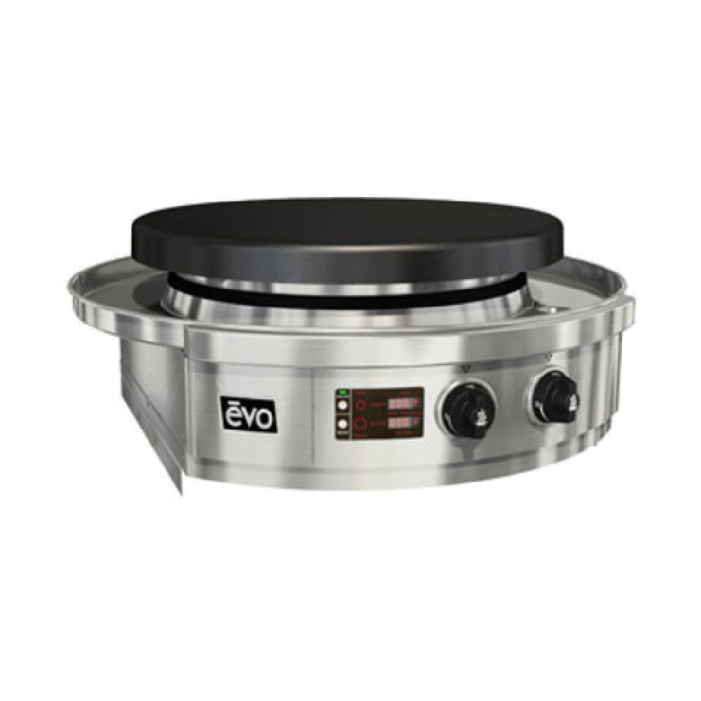 The EVO 10-0062-EL Evo® Affinity 25E Commercial Series Drop-In Cooktop is a cutting-edge electric appliance designed for indoor culinary environments. Featuring a 25-inch diameter black seasoned steel cooking surface, this cooktop functions as a plancha, ideal for diverse cooking applications. The unit is equipped with two round inner and outer digital display temperature zones, allowing precise control over cooking temperatures ranging from 225°F to 525°F (107°C to 274°C). Its electronically monitored dual zone heater ensures consistent heating performance. Separate analog control knobs provide users with intuitive temperature adjustments. A stainless steel drip pan and spill collection trays enhance its usability by simplifying clean-up and maintaining hygiene standards. This cooktop can be seamlessly mounted into various kitchen setups, adding to its versatility. Additionally, it includes a cleaning kit, two stainless steel spatulas, and one stainless steel scraper, offering convenience and value for professional chefs. Operating at 208-230v with a single-phase power requirement and drawing 30 amps, this unit is NSF certified, ensuring compliance with public health standards. Proudly made in the USA, the EVO Affinity 25E is an asset to commercial kitchens seeking efficiency and advanced cooking technology.