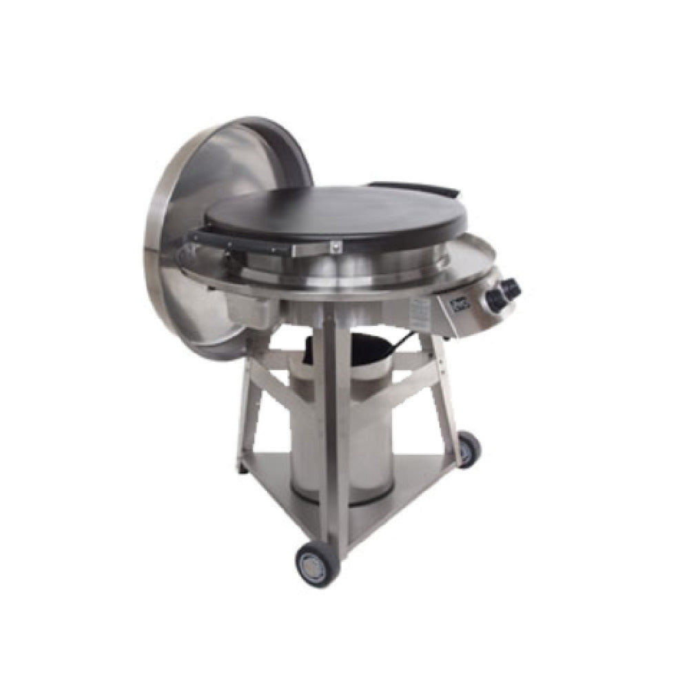 The EVO 10-0081-LP (QUICK SHIP) Evo® Professional Commercial Series Cooking Station is a top-tier outdoor culinary appliance designed for professional settings. This cooking station features a 30-inch diameter black seasoned steel removable cooking surface, also known as a plancha, which supports versatile cooking options. It is equipped with two distinct temperature zones - inner and outer - that range from 225°F to 550°F (121°C to 288°C), enabling precise control over cooking processes. Users can manage these zones through separate control knobs for the inner and outer burners, supplemented by an electronic push-button ignition for easy startup. Mounted on a wheeled cart with a rear handle, the station offers mobility and convenience. It integrates a stainless steel tank sleeve and a quick-release stainless steel drip pan for easy maintenance, alongside a side-mounted spill collection tray. With an impressive output of 48,000 BTU, the unit promises efficient performance. The package includes a cleaning kit, two stainless steel spatulas, and a stainless steel scraper. Certified by NSF and CE, the cooking station is proudly made in the USA and is available for quick shipment within 1-2 days, catering to fast-paced commercial environments.