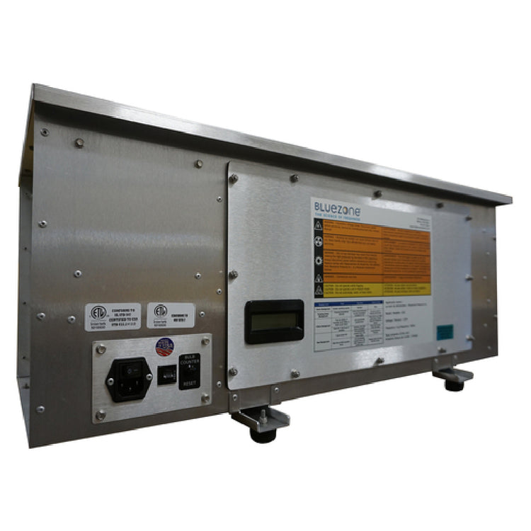 The Bluezone 10-BZ-450VK Bluezone Viral Kill Air Purifier For Indoor Dining Or Stand Alone is a state-of-the-art air purification unit engineered to enhance indoor air quality significantly. Designed by Evo America, LLC (Middleby), this purifier efficiently treats up to 9,000 cubic feet of air per unit, making it suitable for various environments, from indoor dining areas to standalone applications. At the core of its operation are two UV-C germicidal bulbs, which play a crucial role in eliminating airborne viral particles. The purifier boasts a digital display screen for easy monitoring and control. Its design includes versatile mounting options with rails and feet, allowing it to adapt seamlessly to different spaces. Operating at 350 watts, the unit requires a 120v/60/1-ph electrical connection and runs at 3.0 amps, ensuring energy-efficient performance. With certifications from cETLus and ETL-Sanitation, the Bluezone 10-BZ-450VK adheres to stringent safety and sanitation standards. This air purifier is an ideal choice for businesses looking to provide a safer environment by improving air quality in large indoor spaces, offering an essential solution with its advanced technological features and substantial air treatment capacity.