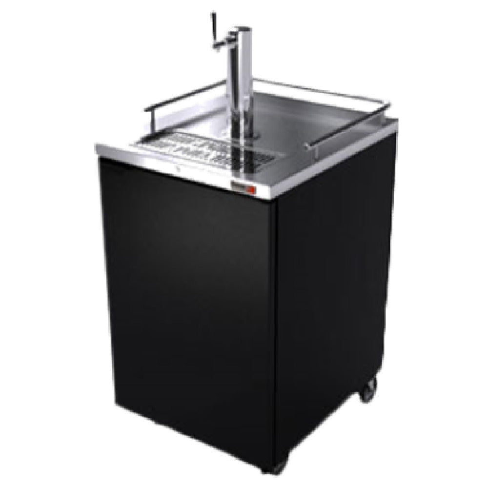 The Fagor Refrigeration FDD-24-N 19072201 Draft Beer Cooler Portable (1) Keg Capacity is a meticulously designed unit engineered to cater to the diverse needs of the beverage industry. With a sleek black exterior finish, it integrates seamlessly into various service environments. This draft beer cooler features a robust 18-gauge stainless steel top, ensuring durability and longevity, while its stainless steel interior and floor, complemented by a removable polymer floor protector, offer easy maintenance and cleanliness. The unit includes an analog thermostat for precise temperature control, catering to the preference of different market segments that prioritize reliable refrigeration. With a single faucet tower and a secure single door with locks, it ensures both accessibility and security. Mobility is enhanced by its castors, allowing for effortless repositioning within a venue. Powered by a self-contained refrigeration system with a 1/6 hp motor, this unit maintains consistent cooling performance. Certified by ETL cETLus, UL, and NSF, and made in North America, it reflects high standards of safety and compliance. The Fagor Refrigeration Draft Beer Cooler is a versatile solution for bars, restaurants, and catering services, providing efficient performance and ease of use in a compact footprint.