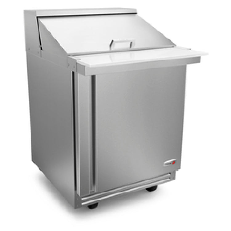 The Fagor Refrigeration FMT-27-12-N 19086001 Mega Top Sandwich/Salad Refrigerator 27-3/4"W stands out as a versatile refrigeration solution for commercial kitchens, catering to sandwich and salad preparation needs with precision. This unit features a 27-3/4" width and includes a field-reversible door, enhancing its adaptability to various kitchen layouts. It offers ample storage with a single adjustable shelf and comes equipped with twelve 1/6 size pans, each 4" deep, providing organized ingredient storage. The refrigerator's stainless steel insulated hood and lid ensure optimal temperature retention, essential for food safety and freshness. An additional 10"D reversible white poly cutting board offers convenience in food preparation. Constructed with a durable stainless steel interior and exterior, the unit promises longevity and ease of cleaning. Mobility is facilitated by 5" casters, two of which have brakes for stability. The front-breathing self-contained refrigeration system, powered by a 1/6 HP compressor, guarantees efficient cooling, while its cETLus and ETL-Sanitation certifications affirm compliance with safety standards. Proudly made in North America, this refrigerator is an ideal choice for food service establishments prioritizing quality and reliability in their kitchen equipment.