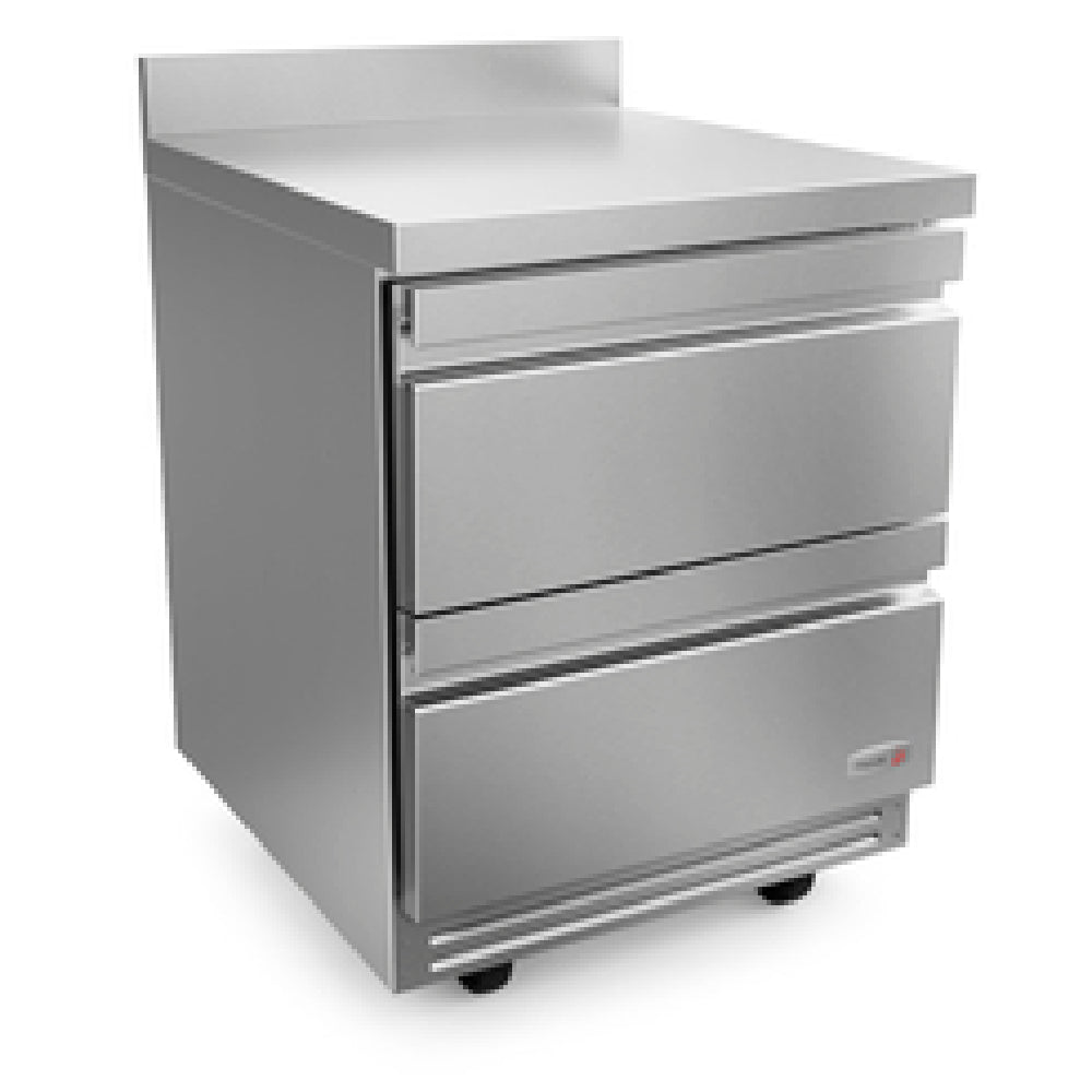 The Fagor Refrigeration FWR-27-D2-N 19095862 Worktop Refrigerator is a versatile one-section appliance designed for various commercial settings. Featuring a compact width of 27-3/4 inches, it offers a substantial 9.5 cubic feet of storage capacity, making it an excellent choice for businesses requiring efficient space utilization. The stainless steel interior and exterior construction ensures durability and an easy-to-clean surface, ideal for maintaining hygiene in busy kitchens. This model boasts two drawers capable of accommodating 4-inch deep pans, although pans are not included. The 4-inch backsplash adds functionality by protecting walls from spills and splashes. Equipped with front-breathing, self-contained refrigeration, this unit is powered by a 1/6 HP motor, providing reliable cooling performance. The inclusion of 5-inch casters, with two featuring brakes, allows for easy mobility and secure placement within a workspace. Certified by cETLus and ETL-Sanitation, the Fagor FWR-27-D2-N meets North American standards for safety and sanitation, making it a trustworthy choice for food service environments. Its compact size combined with robust features renders it suitable for various segments within the food industry, from small cafes to bustling restaurant kitchens, providing an optimal blend of efficiency, reliability, and adaptability.